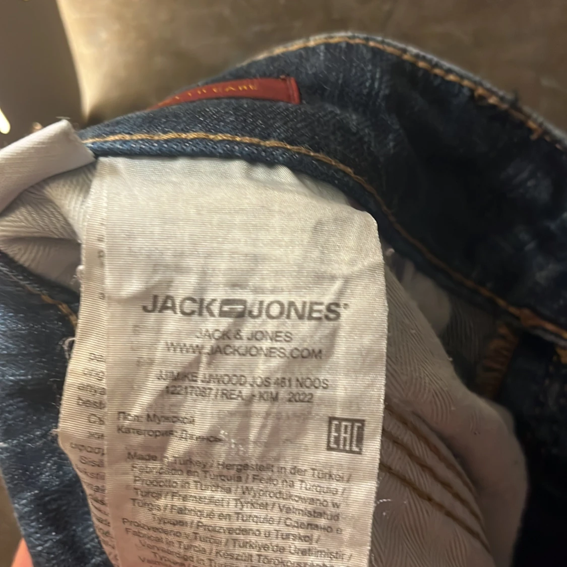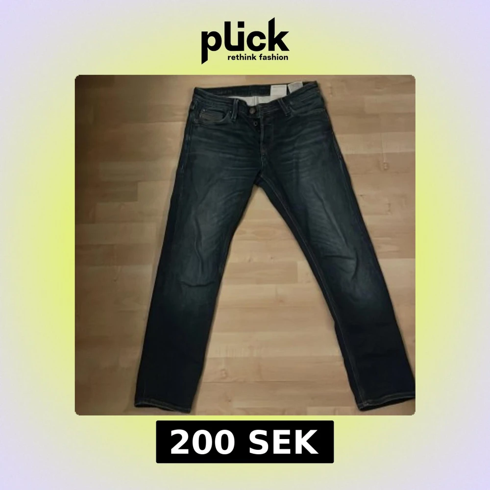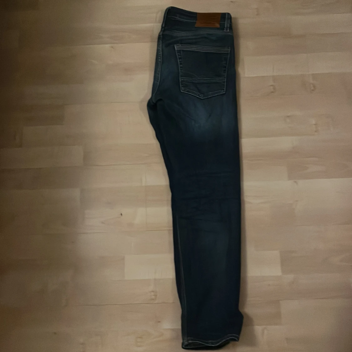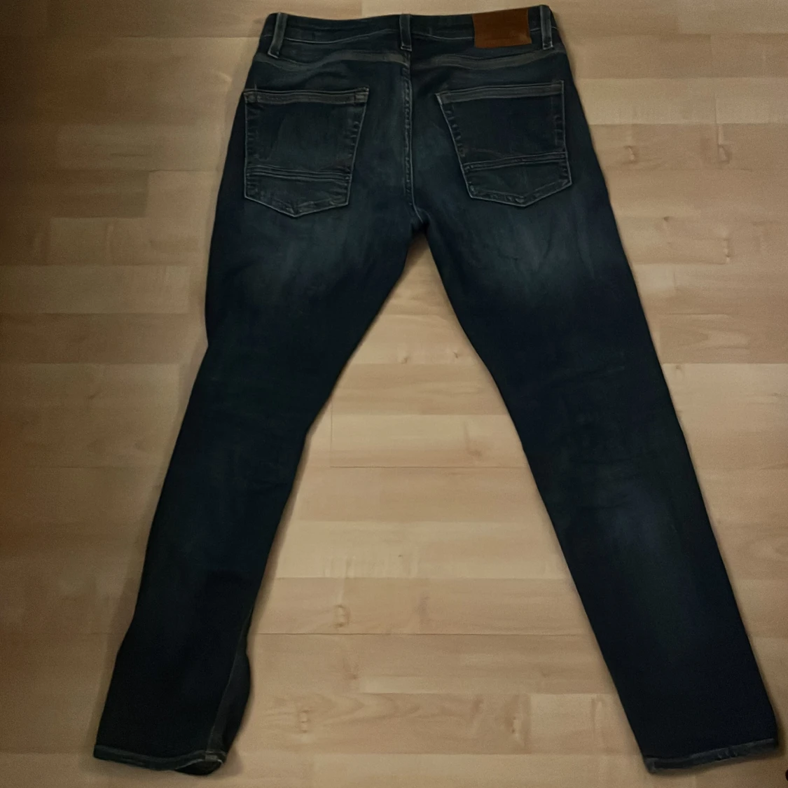 Säljer ett par mörkblå jeans från Jack & Jones. De har en klassisk femficksdesign och en snygg tvättad look. Perfekta för en avslappnad stil. Midjan är normal och passformen är straight.