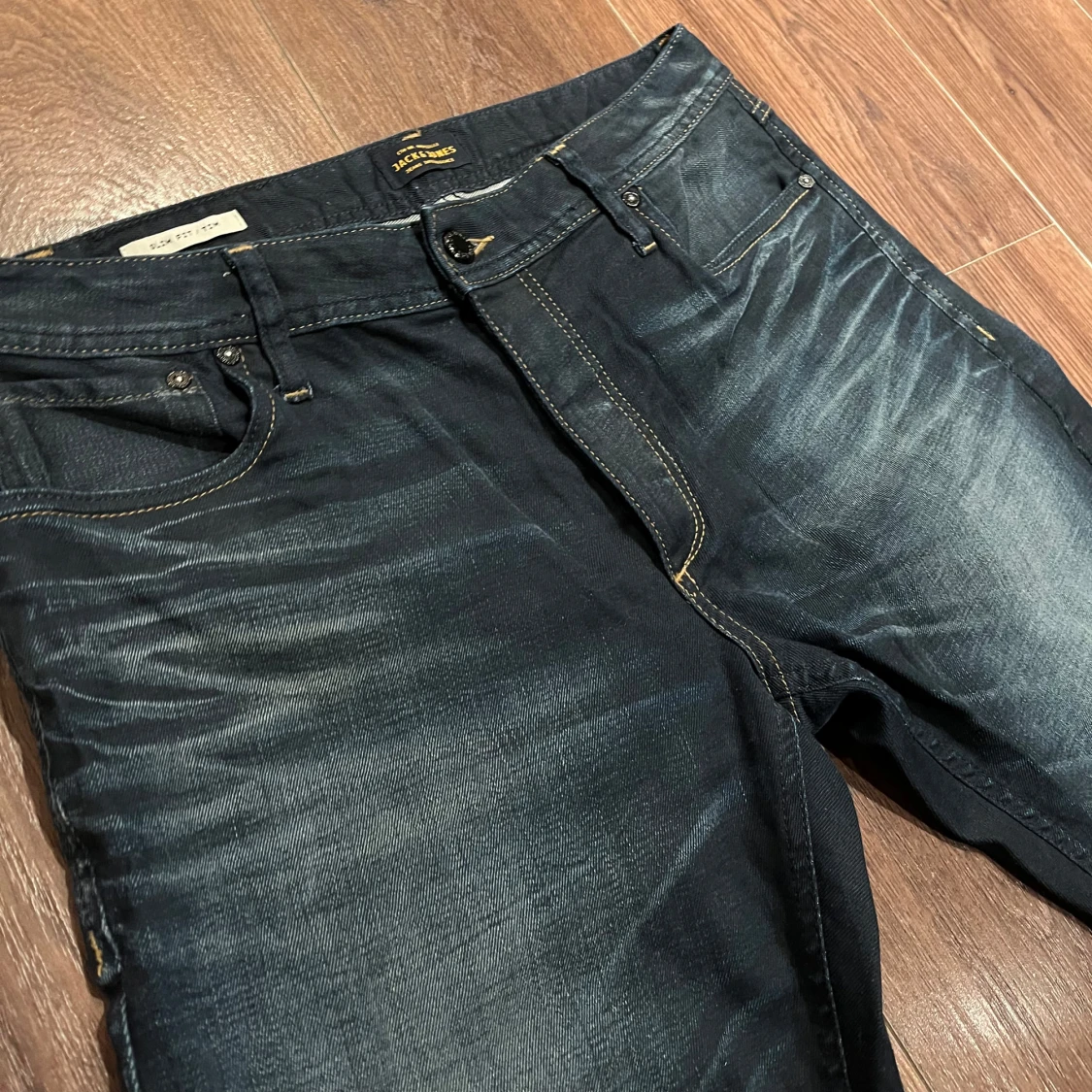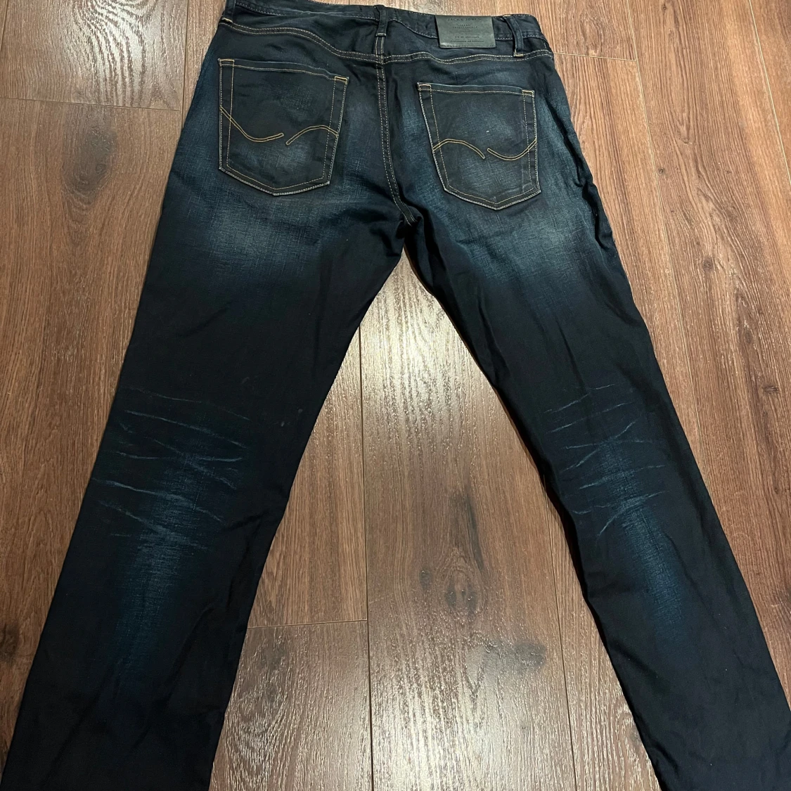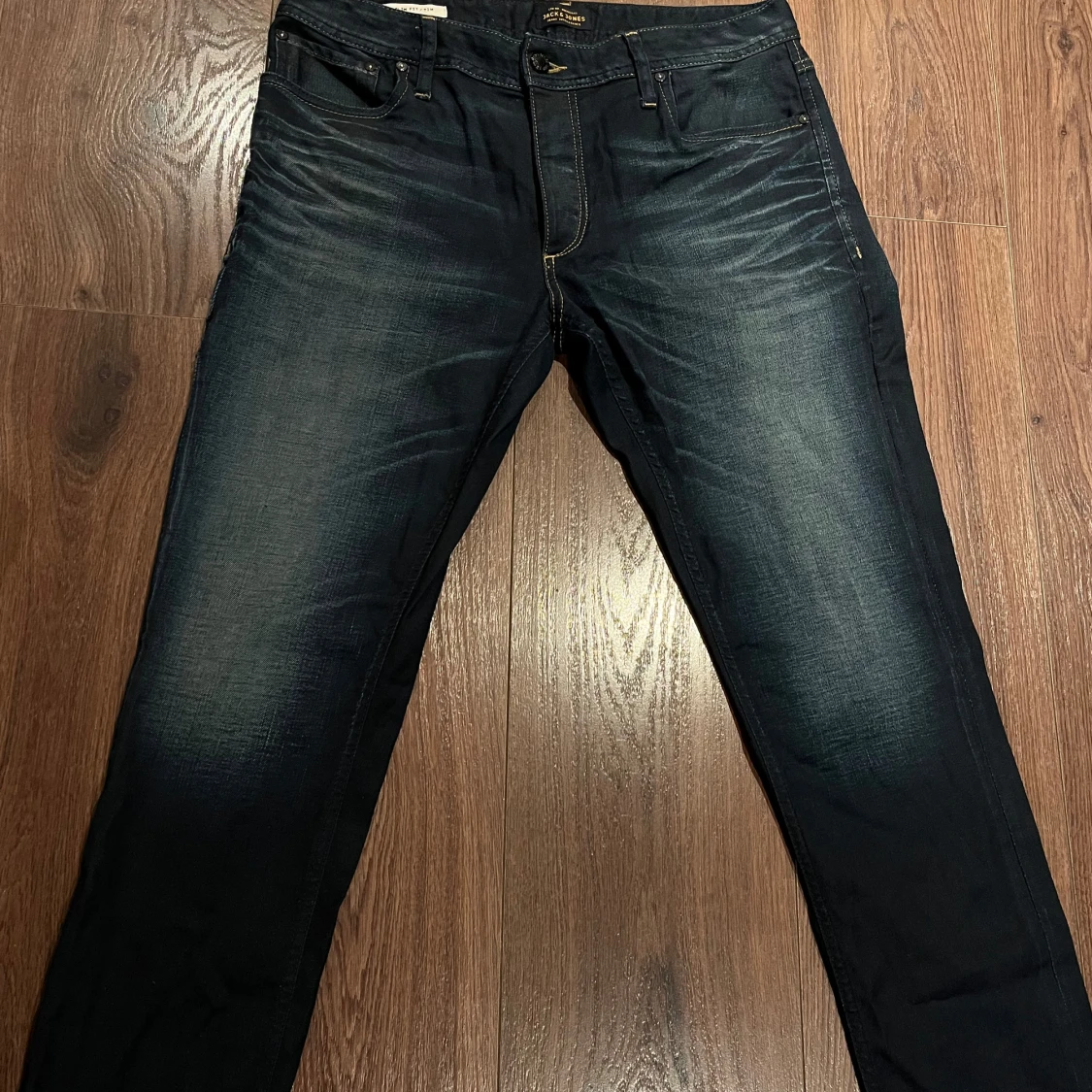 Snygga mörkblå jeans från Jack & Jones med klassisk femficksdesign och kontrastsömmar. Jeansen har en straight passform och är tillverkade i slitstarkt denim. Perfekta för en avslappnad stil. Storlek: W32L32. I mycket bra skick!