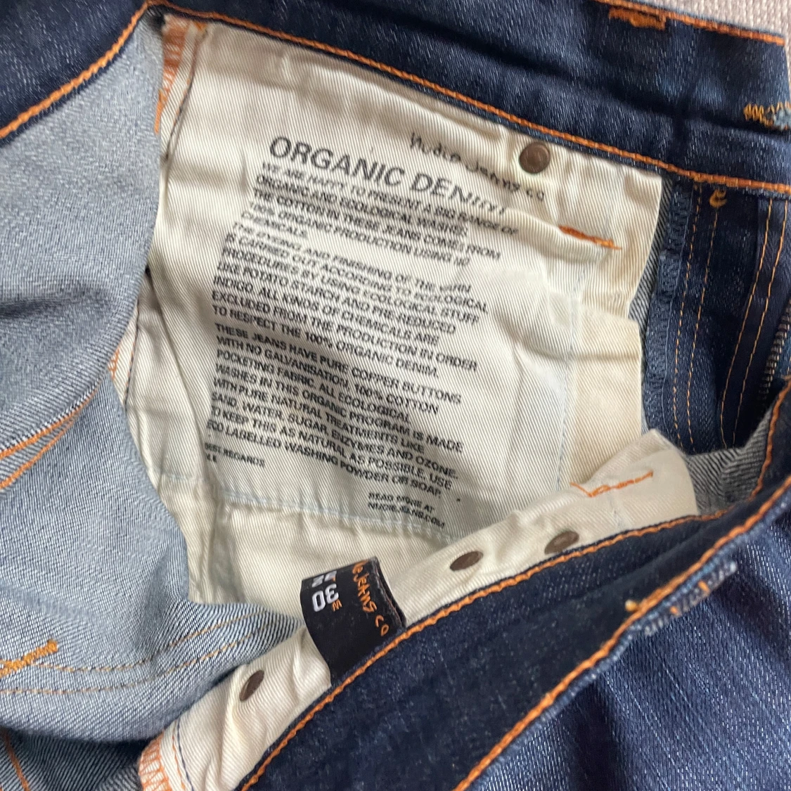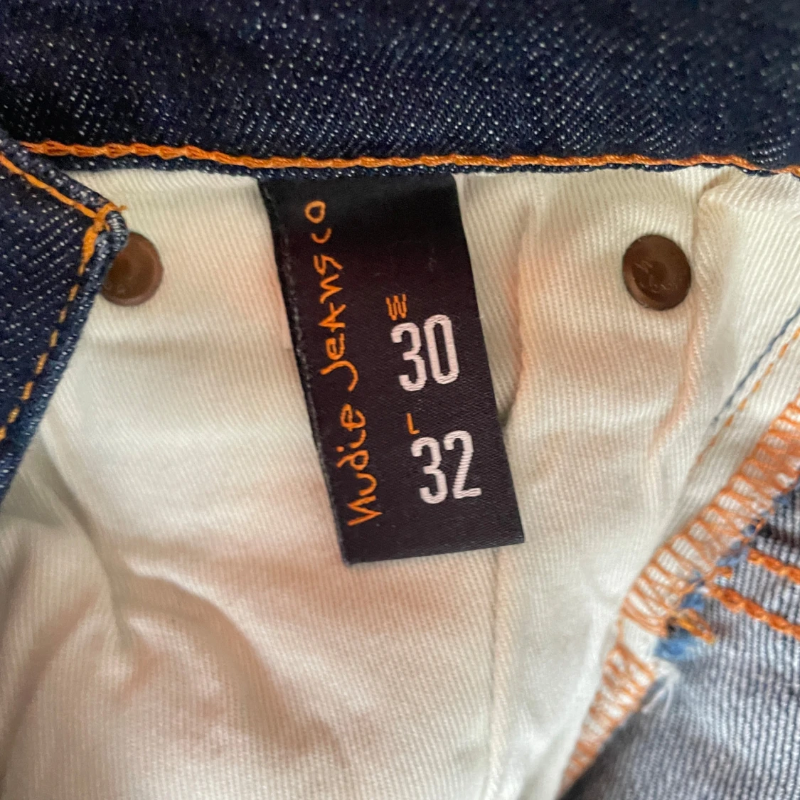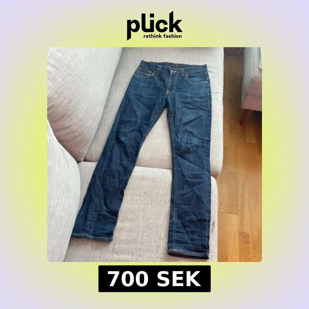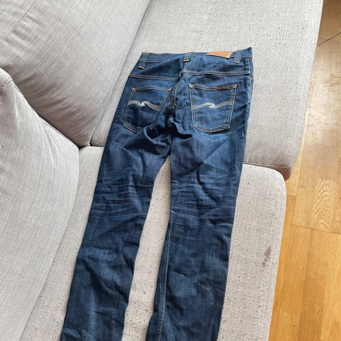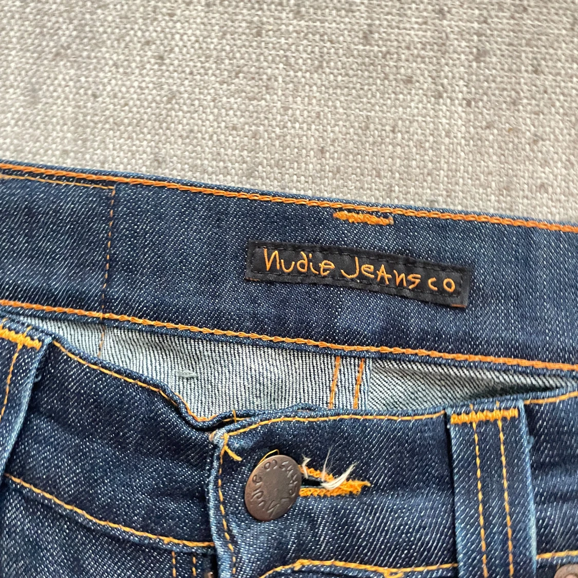 Säljer ett par mörkblå jeans från Nudie Jeans med klassisk femficksdesign och kontrastsömmar. Jeansen är tillverkade i ekologisk denim och har raka ben. Perfekta för dig som gillar stilrena och tidlösa jeans.