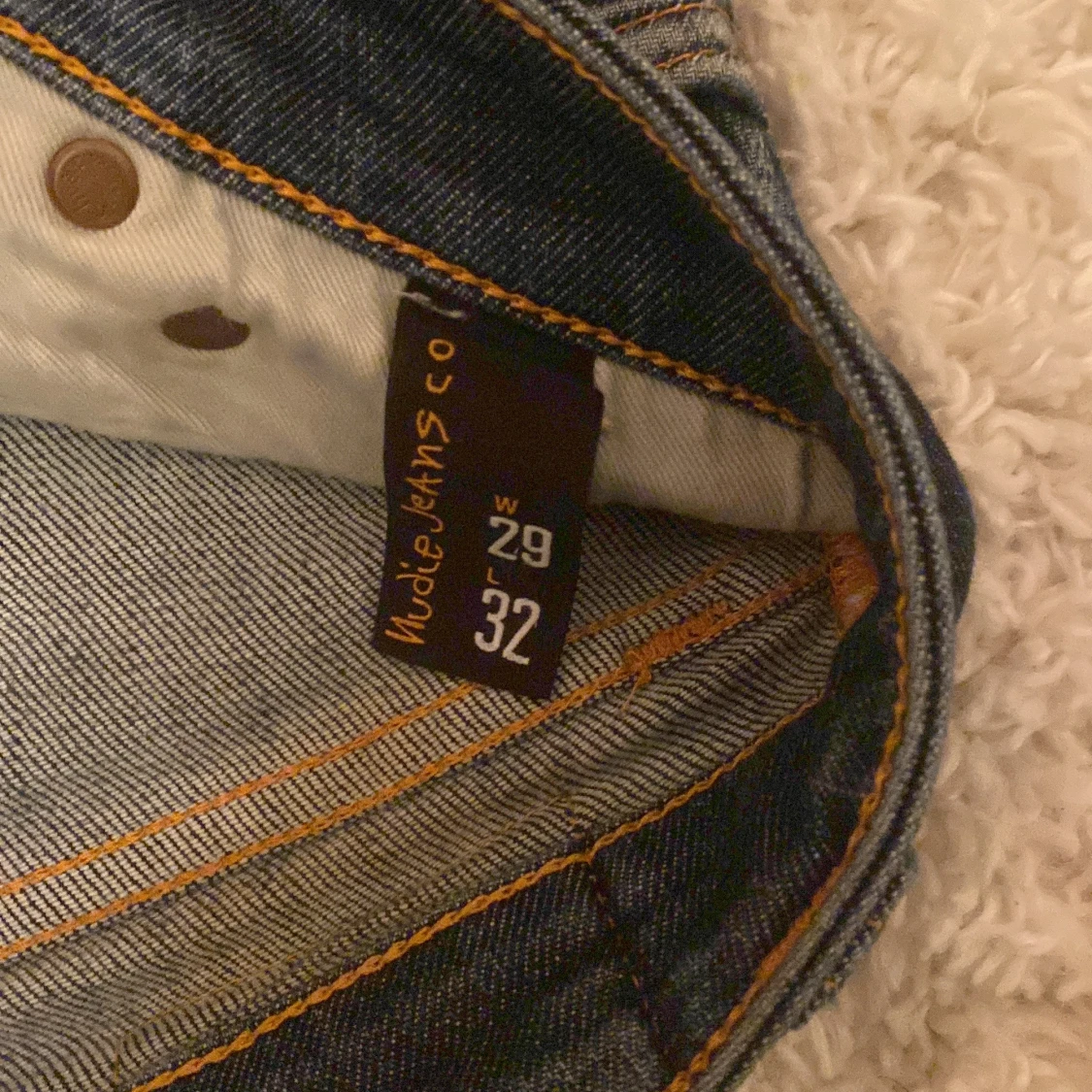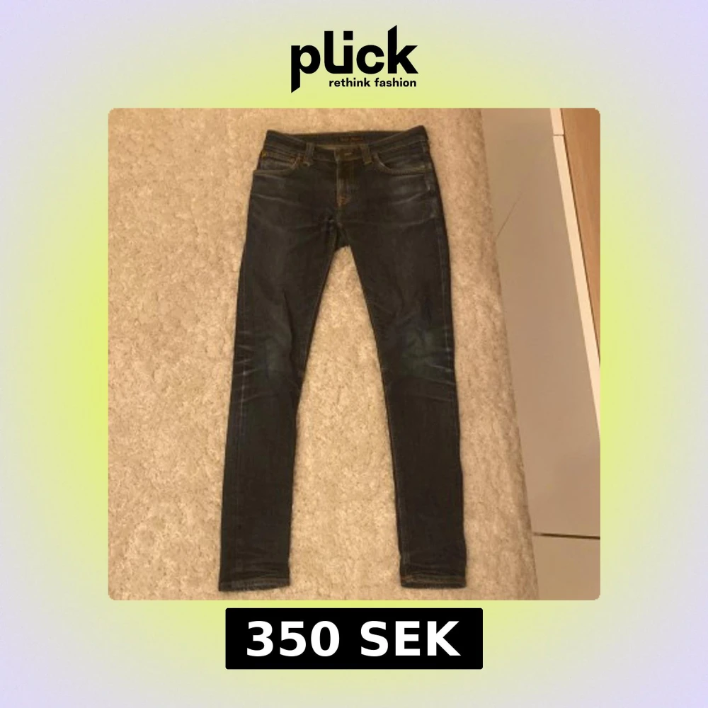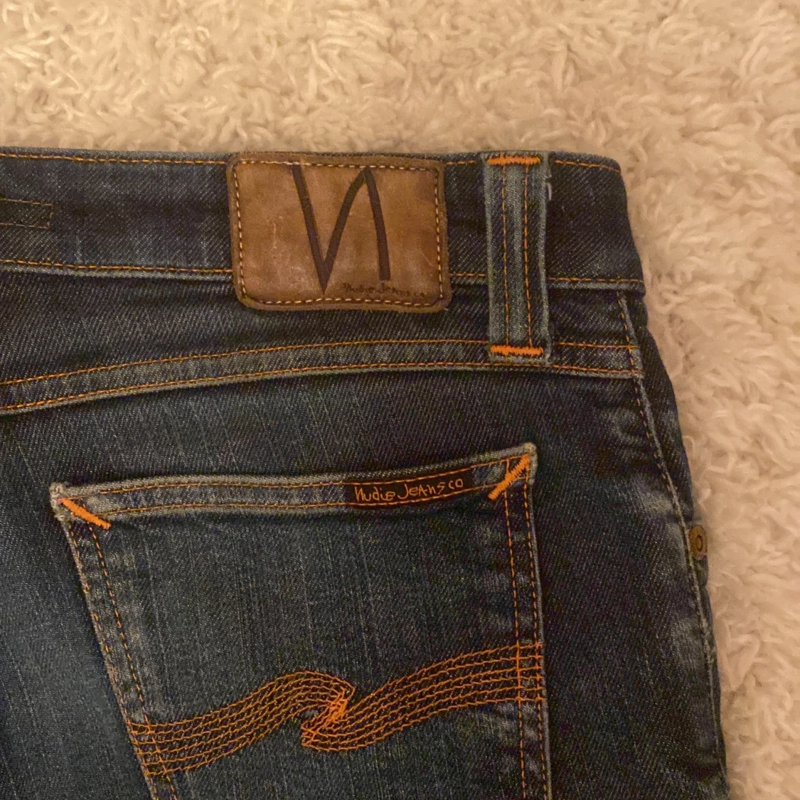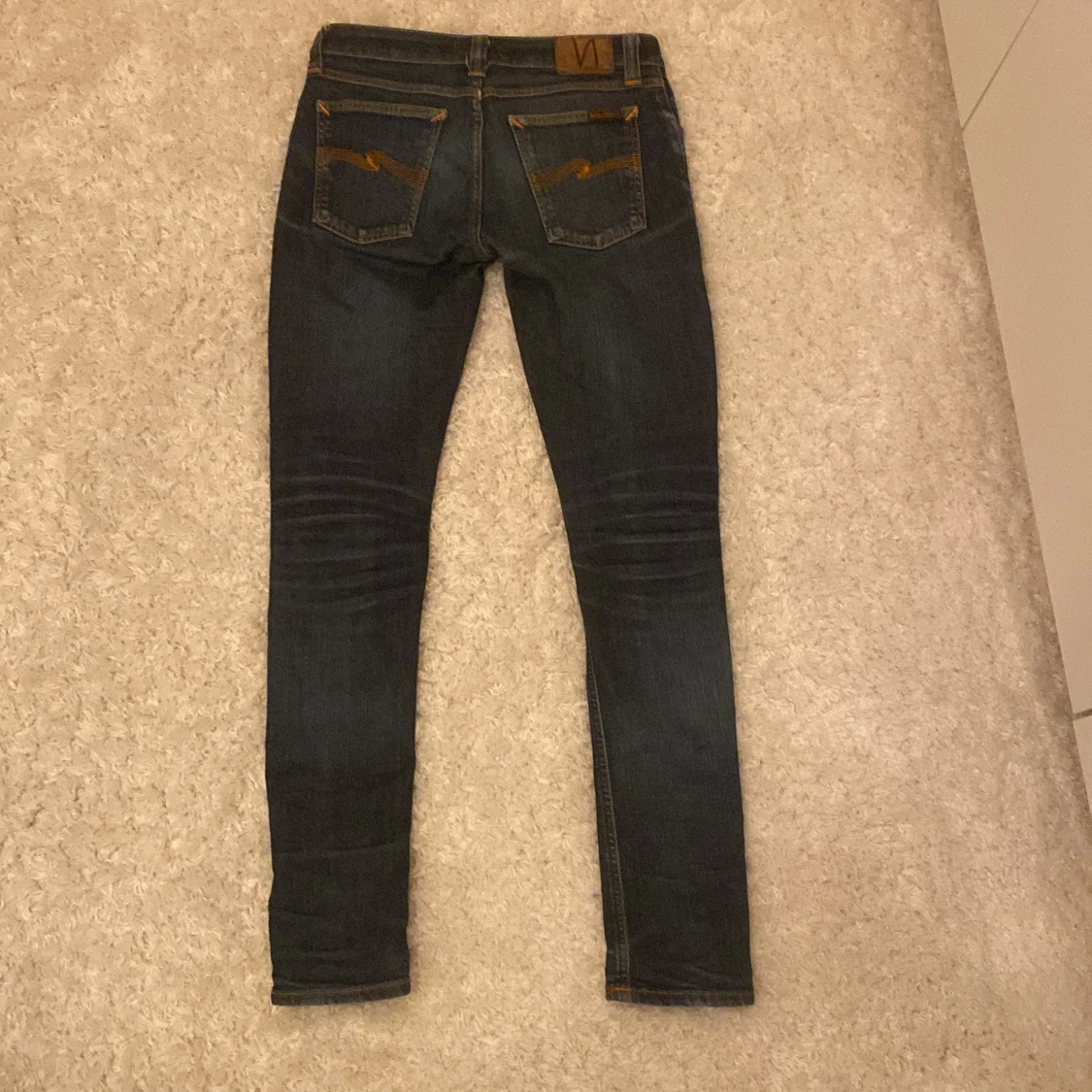 Snygga mörkblå skinny jeans från Nudie Jeans med klassisk femficksdesign och orange sömmar. Perfekta för en stilren look. Midwaist och tillverkade i slitstarkt denim.
