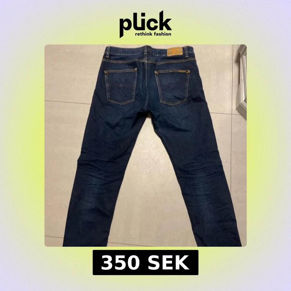 Säljer ett par mörkblå jeans från Nudie Jeans med klassisk femficksdesign och kontrastsömmar. Jeansen har raka ben och snygga detaljer på bakfickorna. Tillverkade i slitstarkt bomullstyg och passar perfekt till en avslappnad stil. Modellen är lean Dean