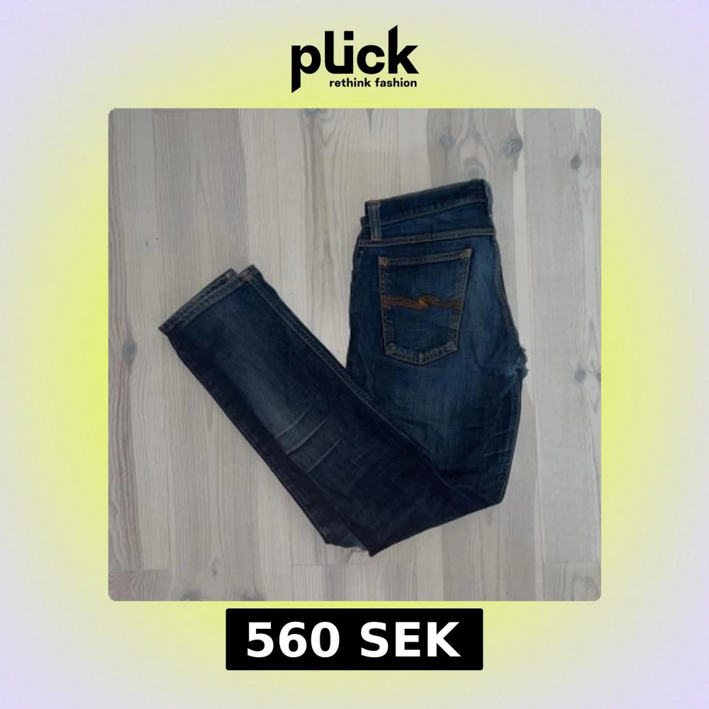 Säljer ett par mörkblå jeans från Nudie Jeans i storlek 32/34. Skicket är bra förutom hål i ett av knäna, i skrevet och i en av fickorna. Hålet i knäet är mest snyggt enligt mig.