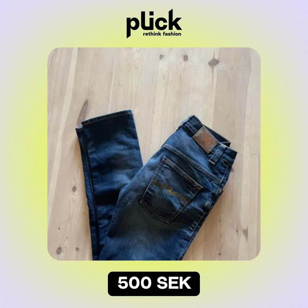 Säljer ett par snygga mörkblå jeans från Nudie Jeans. De har en klassisk femficksdesign och är i storlek 30/34. Jeansen har en cool tvätt med lätt slitna detaljer som ger dem en avslappnad look. Perfekta för både vardag och fest!