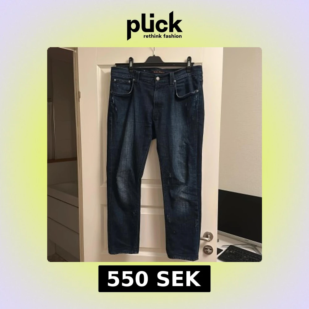 Lean dean. 34w sitttr som 33w, 34l kortat ned de så de är 30l. Snygga mörkblå jeans från Nudie Jeans med klassisk femficksdesign och subtila slitningar på fram- och baksida. Jeansen har raka ben och silverfärgade nitar vid fickorna. Materialet är robust denim i bomull med en cool tvättad look. Inga defekter. Priset är inte hugget i sten!