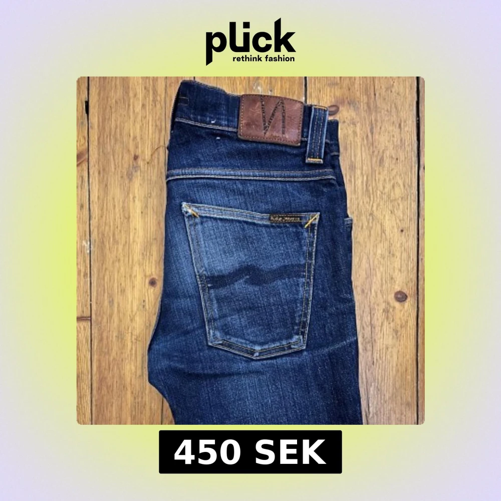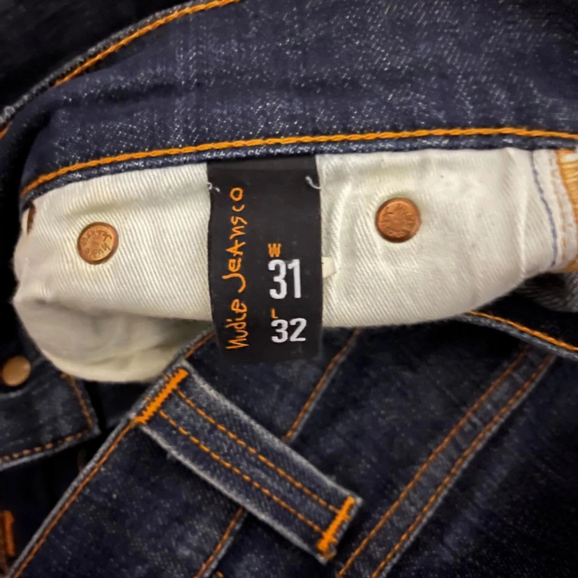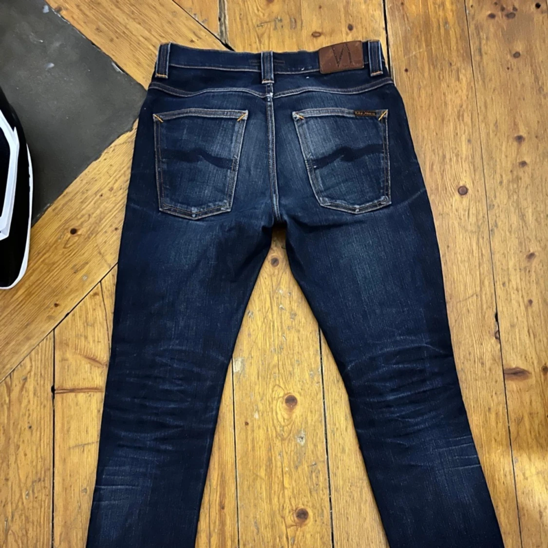 Mörkblå jeans från Nudie Jeans (modell Grim Tim) med riktig fett tvätt och orange sömmar. Jeansen harär tillverkade i högkvalitativt denim. Perfekta för en stilren look. Priset är inte hugget i sten.