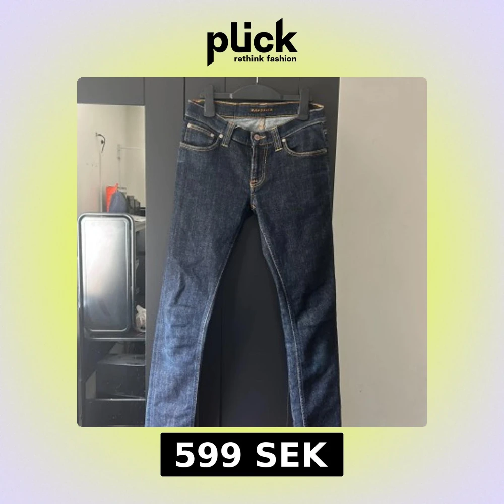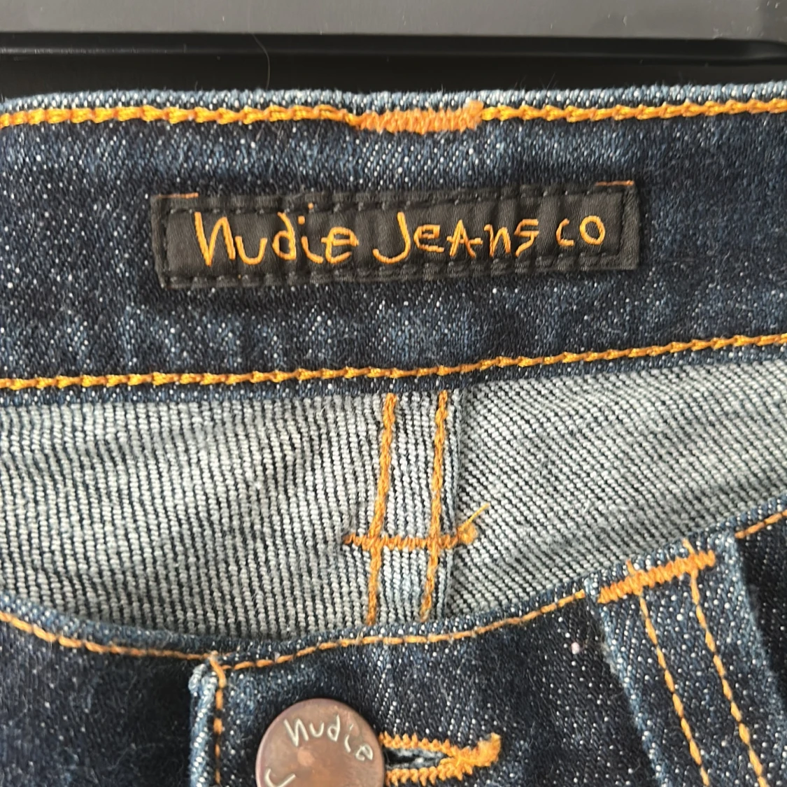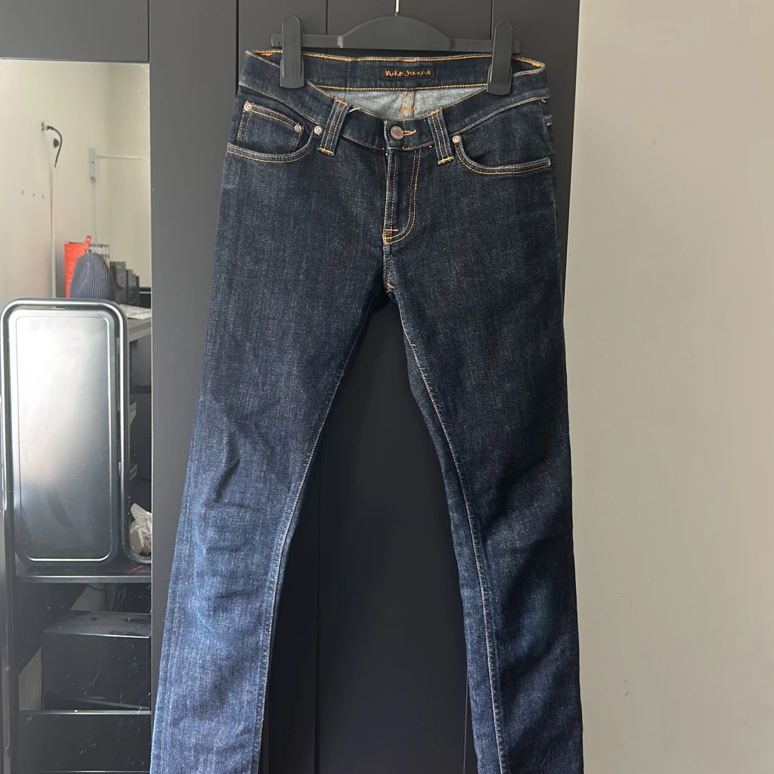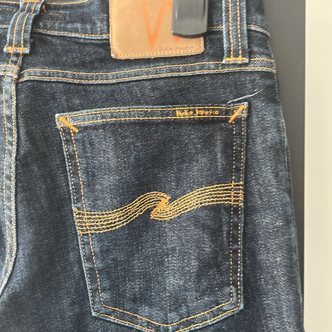 Säljer ett par klassiska mörkblå jeans från Nudie Jeans Co med orangea kontrastsömmar och snygga detaljer på bakfickorna. Jeansen har fem fickor och knappgylf. Perfekta för dig som gillar stilrena och tidlösa jeans. Pris kan diskuteras vid snabb affär
