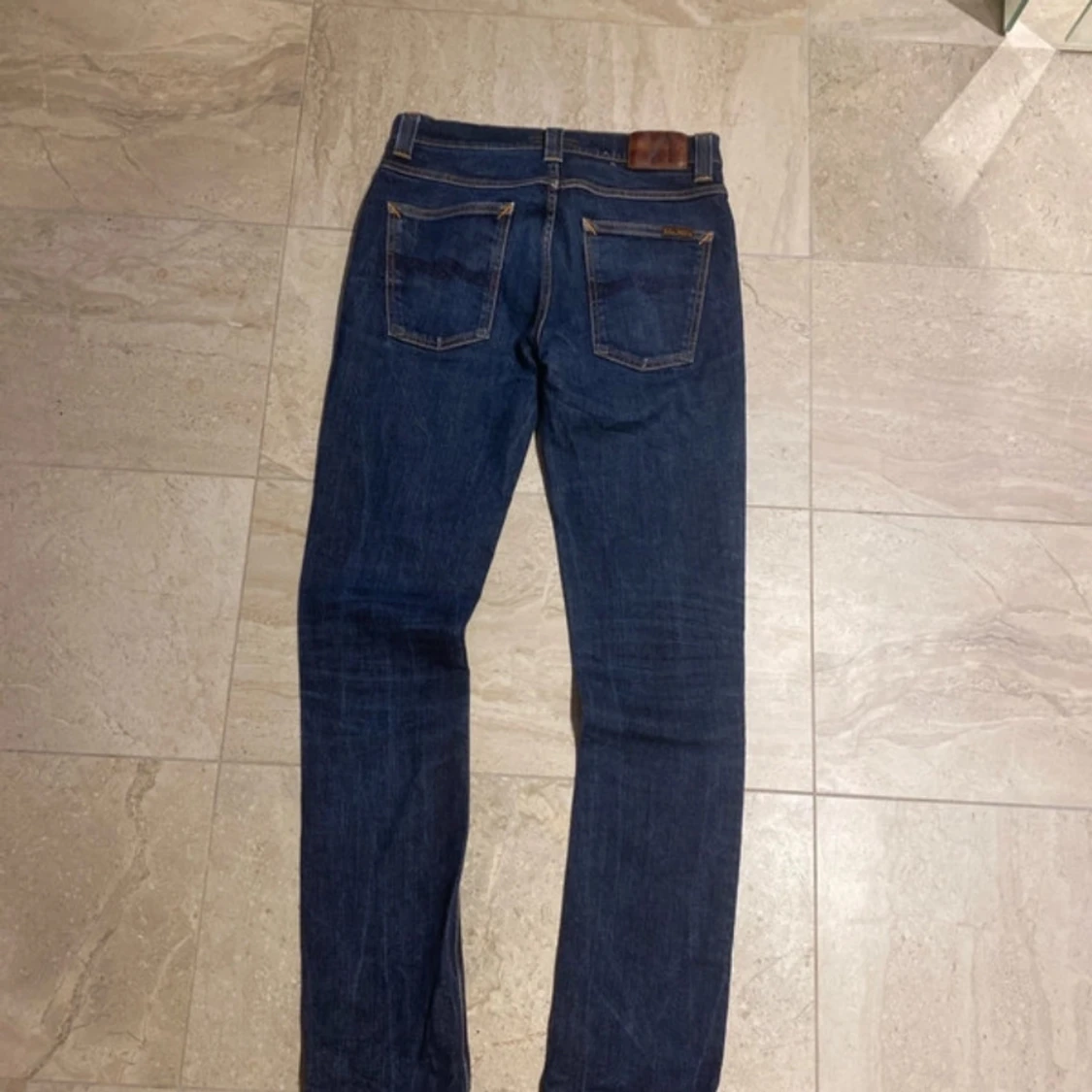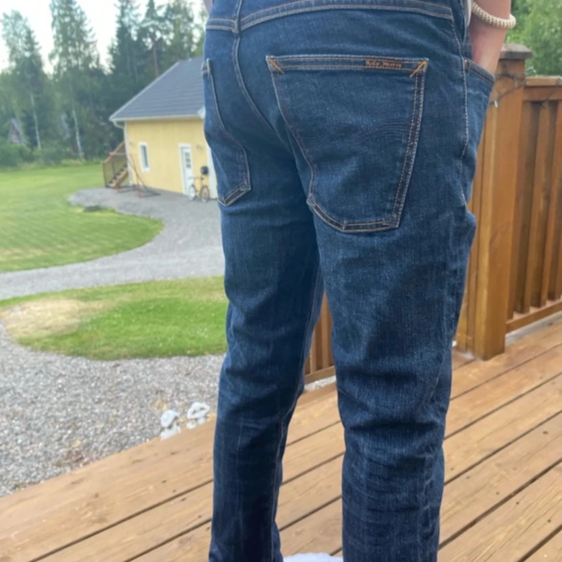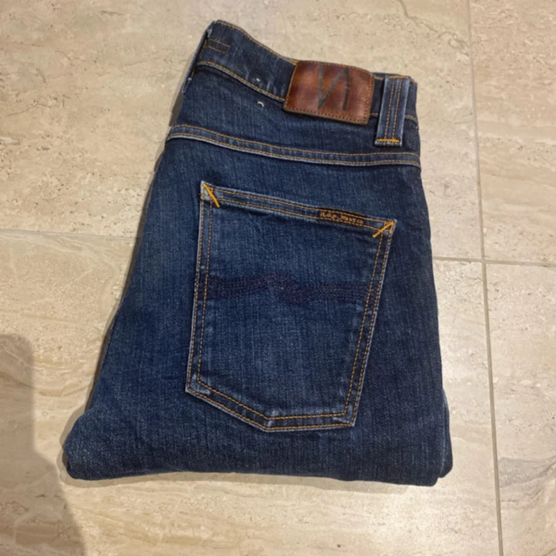 Säljer ett par mörkblå jeans från Nudie Jeans Co i klassisk rak modell. Jeansen har snygga kontrastsömmar, fem fickor och läderpatch bak i midjan. Tillverkade i slitstarkt bomullsjeansmaterial. Perfekta för dig som gillar stilrena och tidlösa jeans. Endast använt ett fåtal gånger, storleken är W33 L36👌