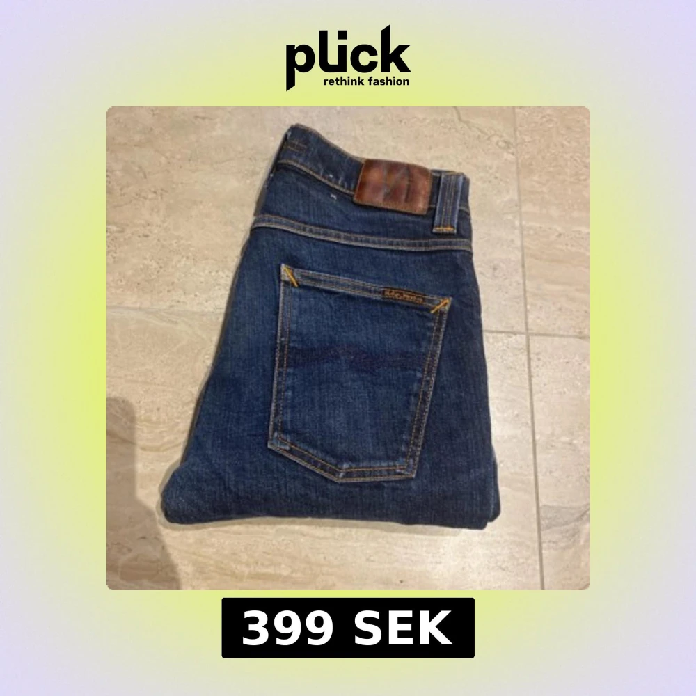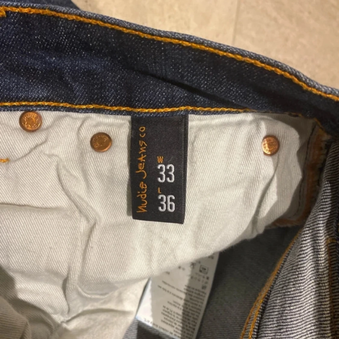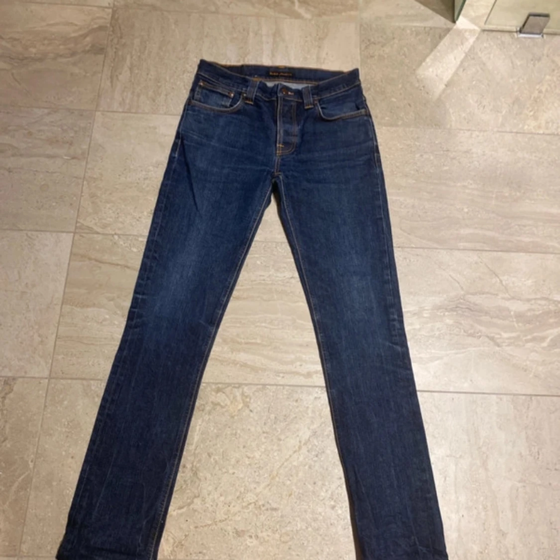 Säljer ett par mörkblå jeans från Nudie Jeans Co i klassisk rak modell. Jeansen har snygga kontrastsömmar, fem fickor och läderpatch bak i midjan. Tillverkade i slitstarkt bomullsjeansmaterial. Perfekta för dig som gillar stilrena och tidlösa jeans. Endast använt ett fåtal gånger, storleken är W33 L36👌