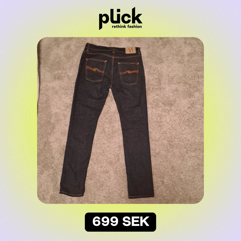 Säljer ett par snygga mörkblå jeans från Nudie Jeans i bra skick. De har en klassisk femficksdesign med orange sömmar och en snygg logga på bakfickan. Perfekta för både vardag och fest! Passar till allt och är superbekväma. De är som nya och använda 2 gånger de är i storleken W 31, L32