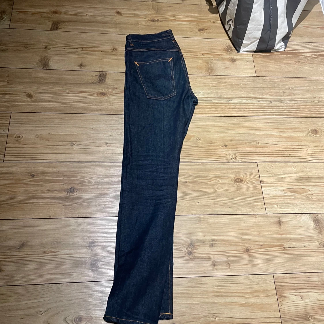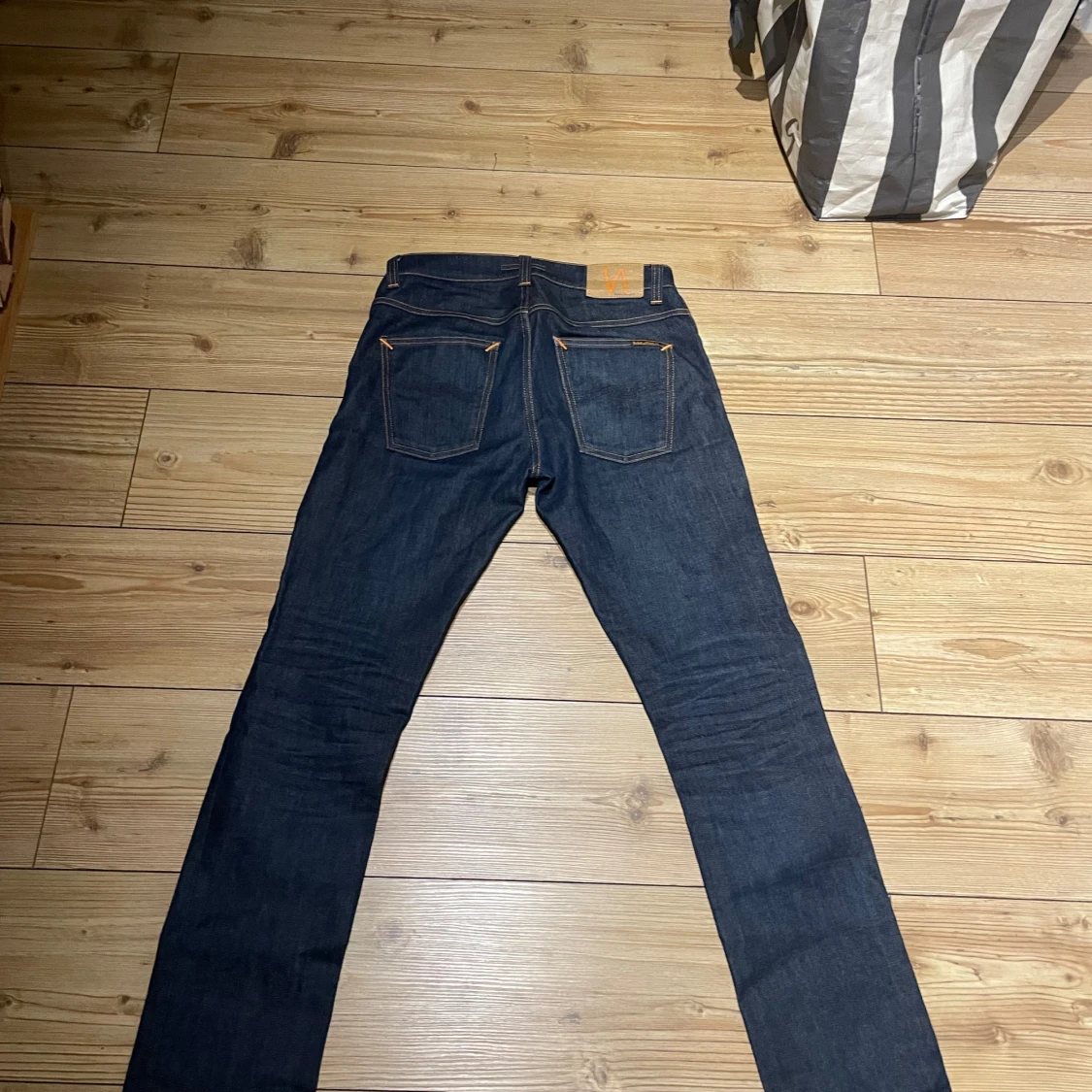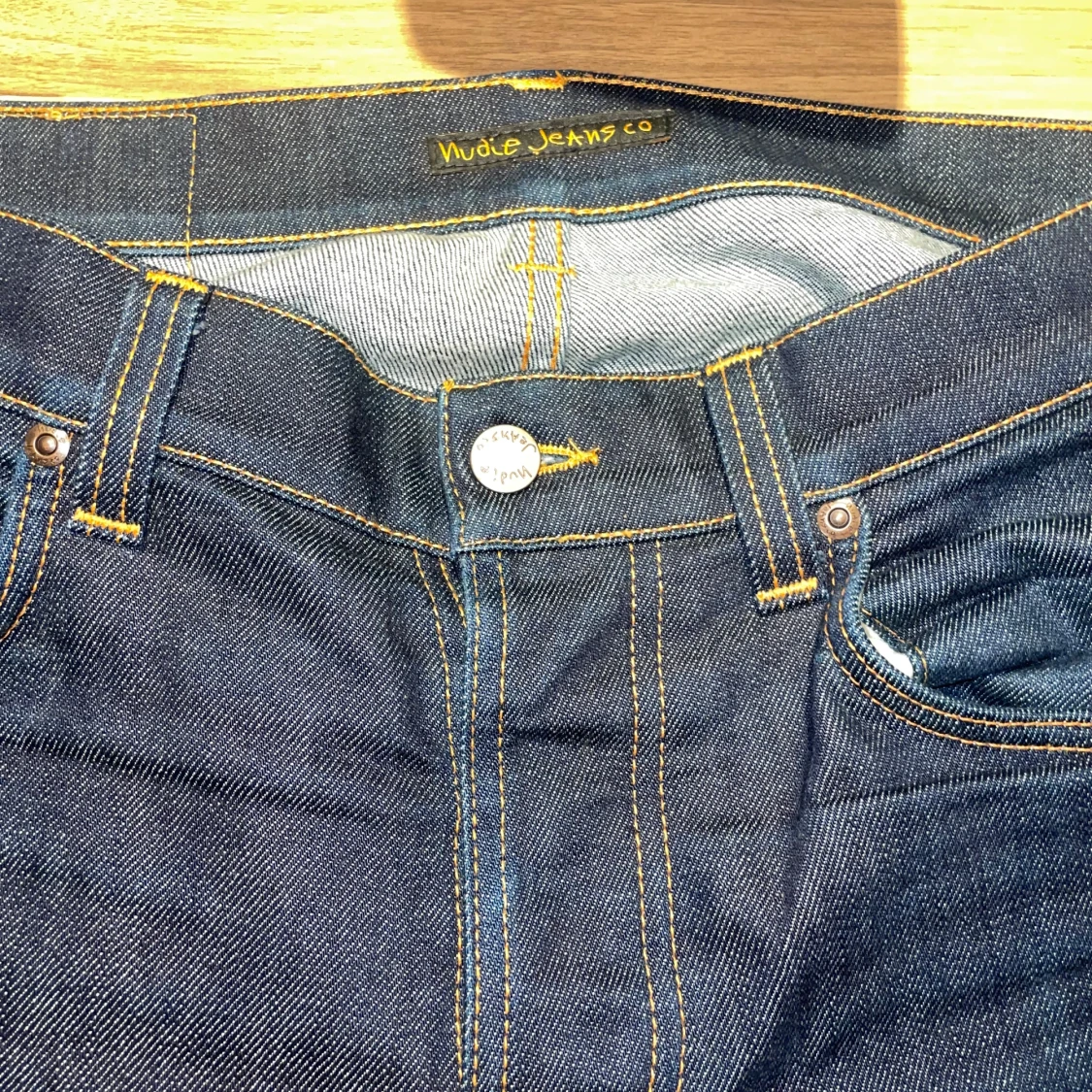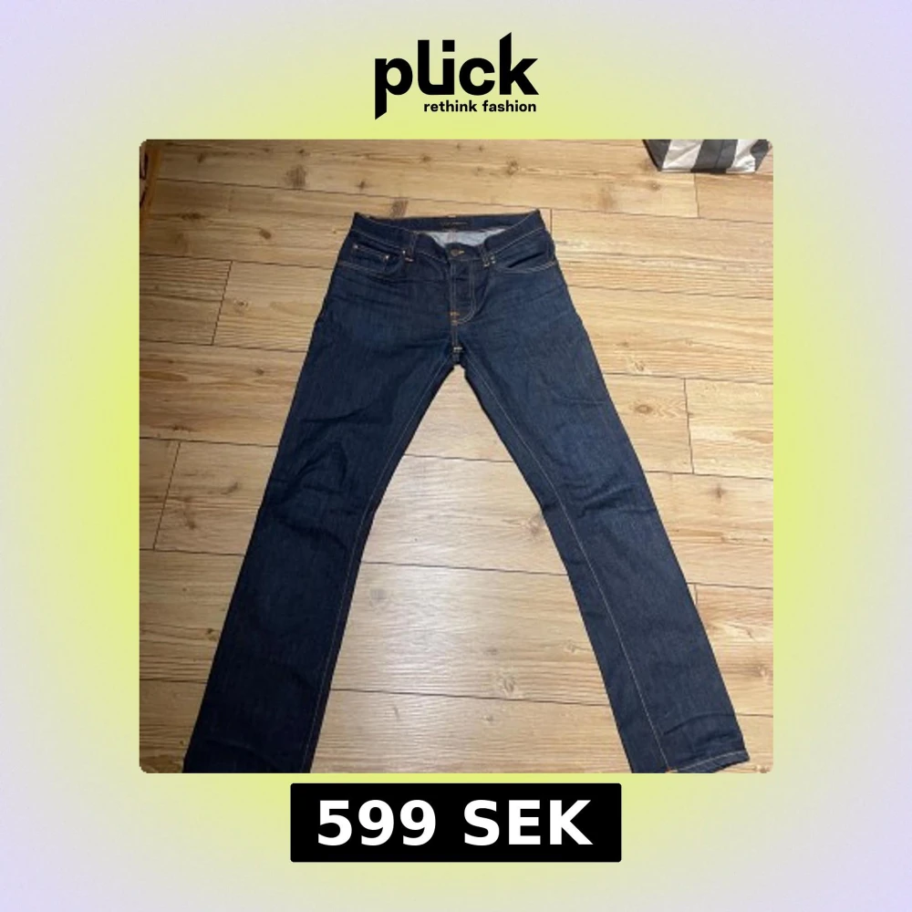 Säljer ett par mörkblå jeans från Nudie Jeans med klassisk femficksdesign och kontrasterande sömmar. Jeansen har en knappgylf och är i en straight passform. Perfekta för en stilren look! Obs priset är inte hugget i sten!