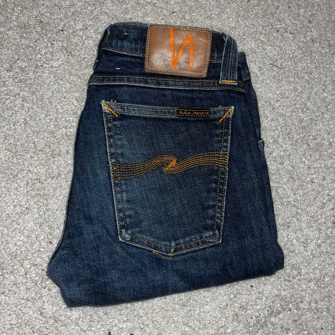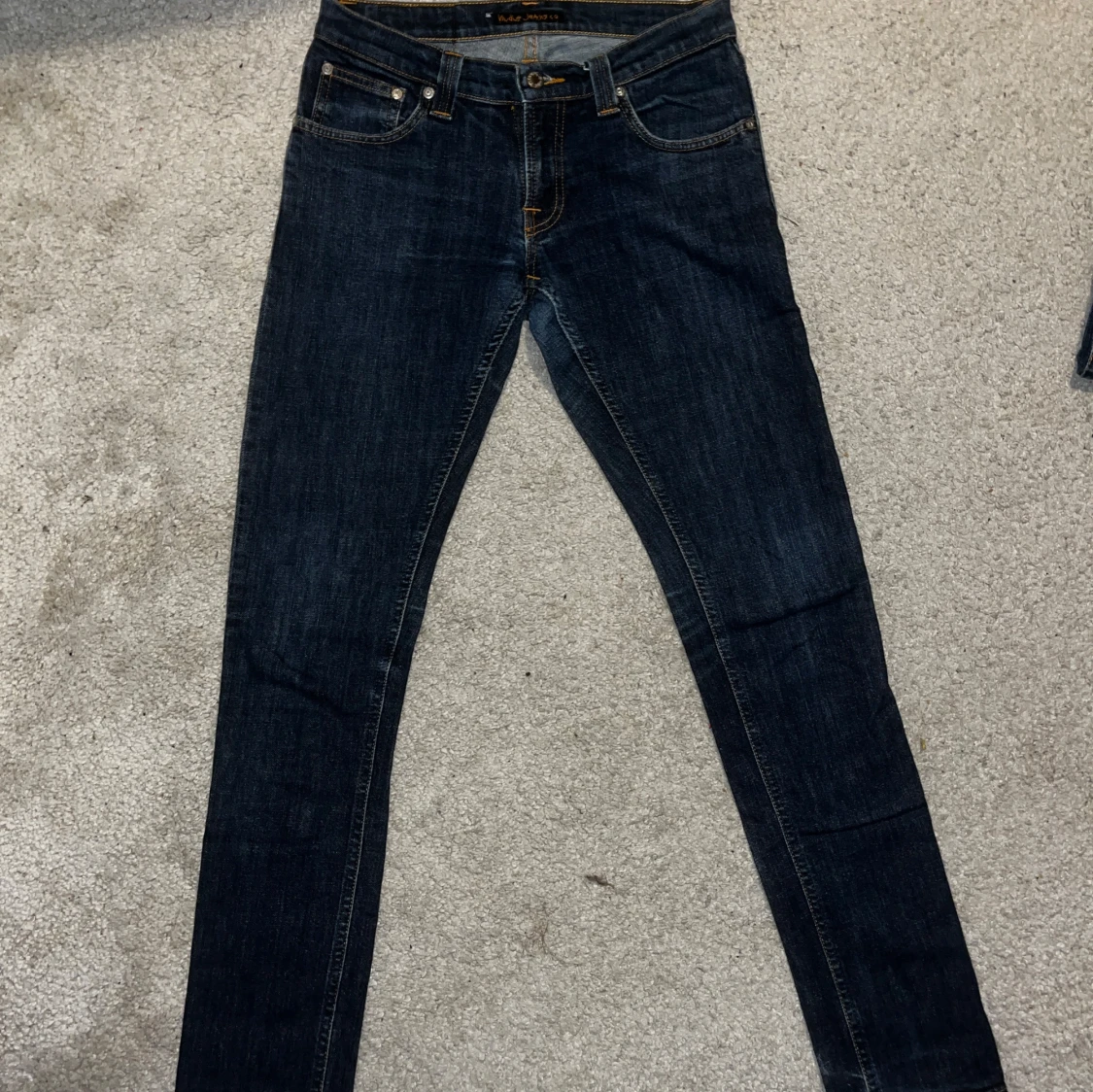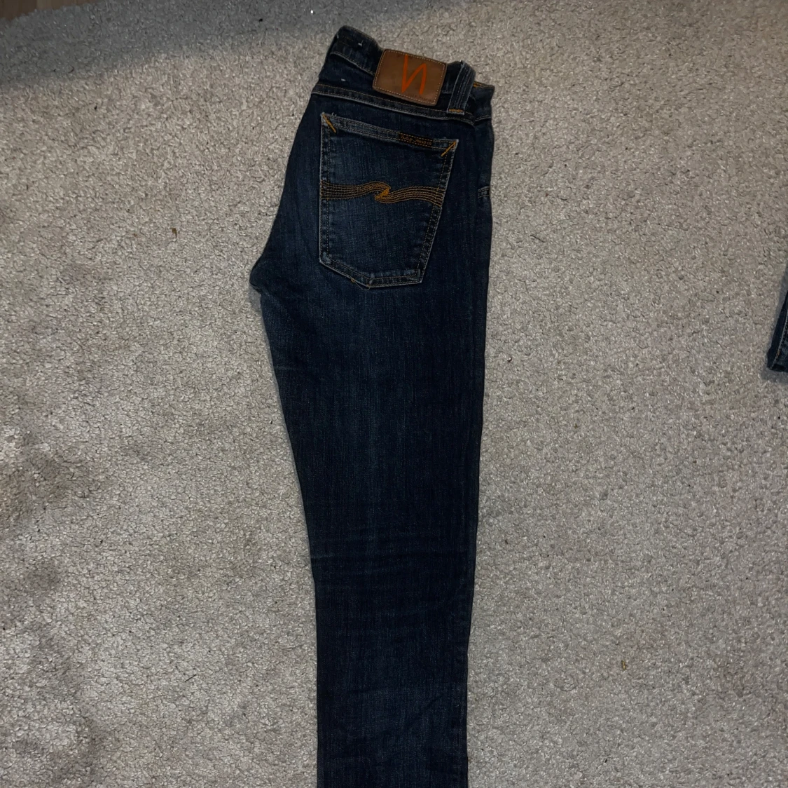 Säljer ett par mörkblå jeans från Nudie Jeans med klassisk femficksdesign och orangea sömmar. Jeansen har en slim fit och är tillverkade i denim med snygga detaljer på bakfickan och läderpatch i midjan.