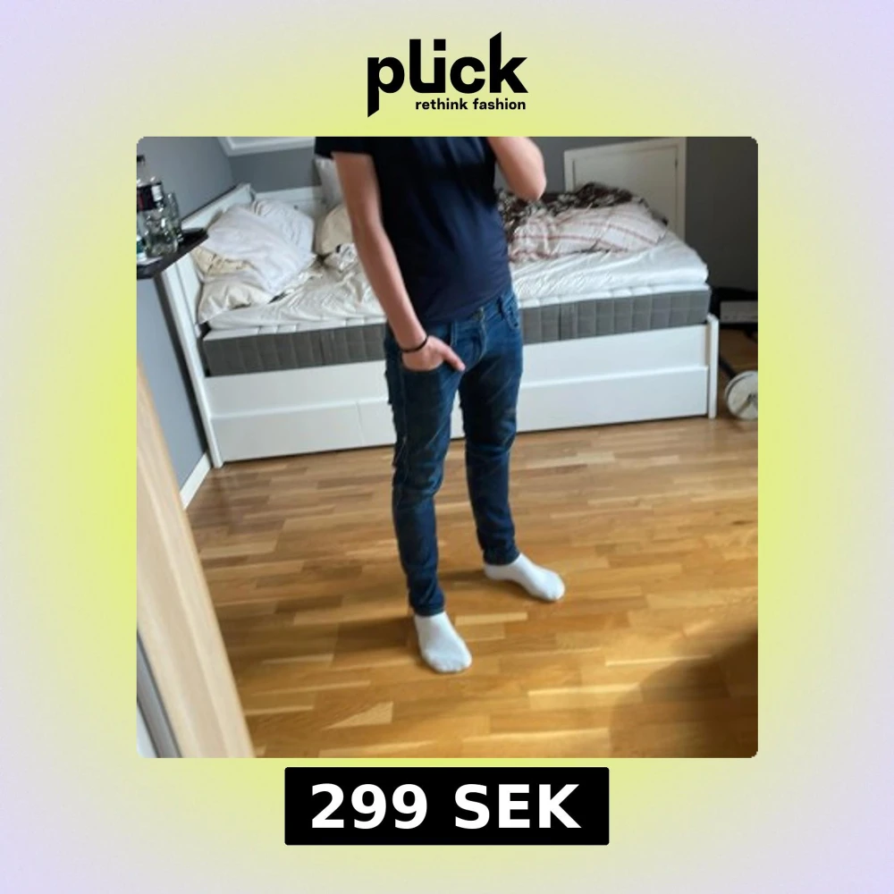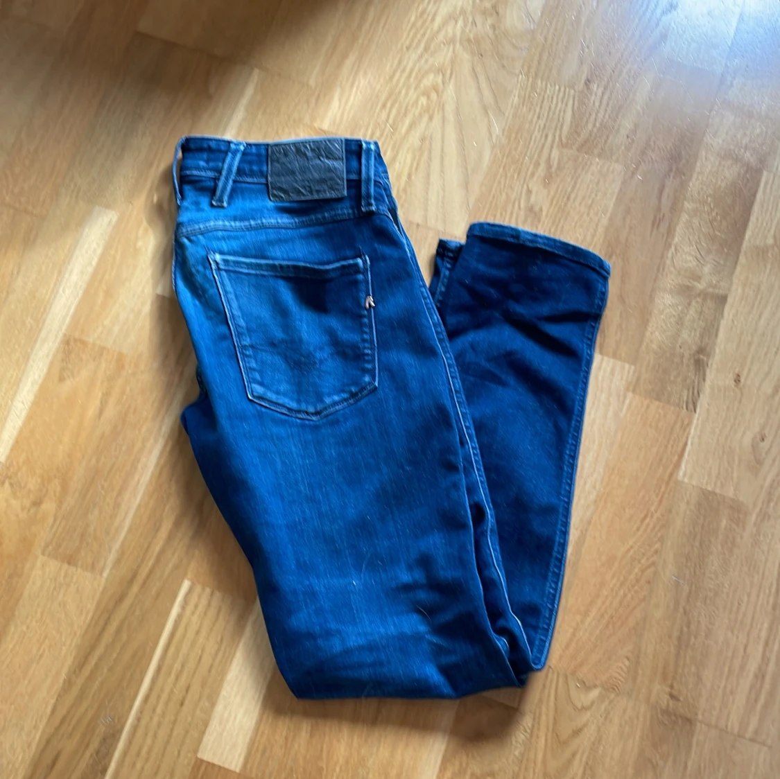 Snygga mörkblå jeansbyxor med en klassisk femficksdesign och knappgylf. Perfekta för en stilren look.