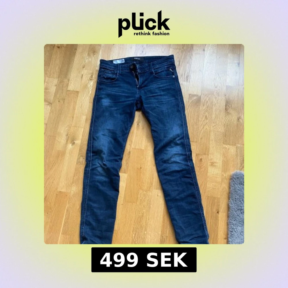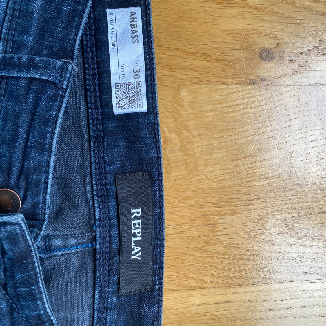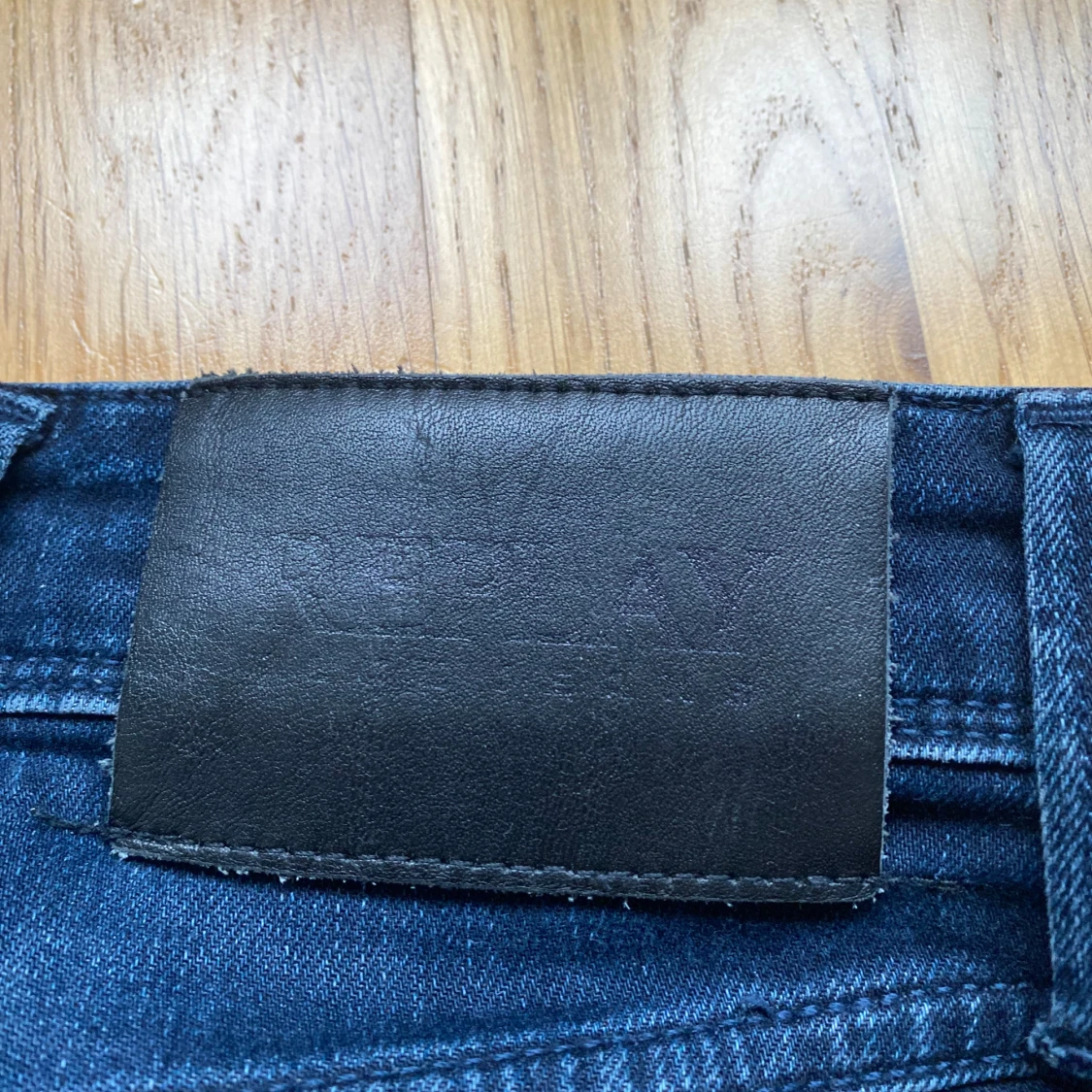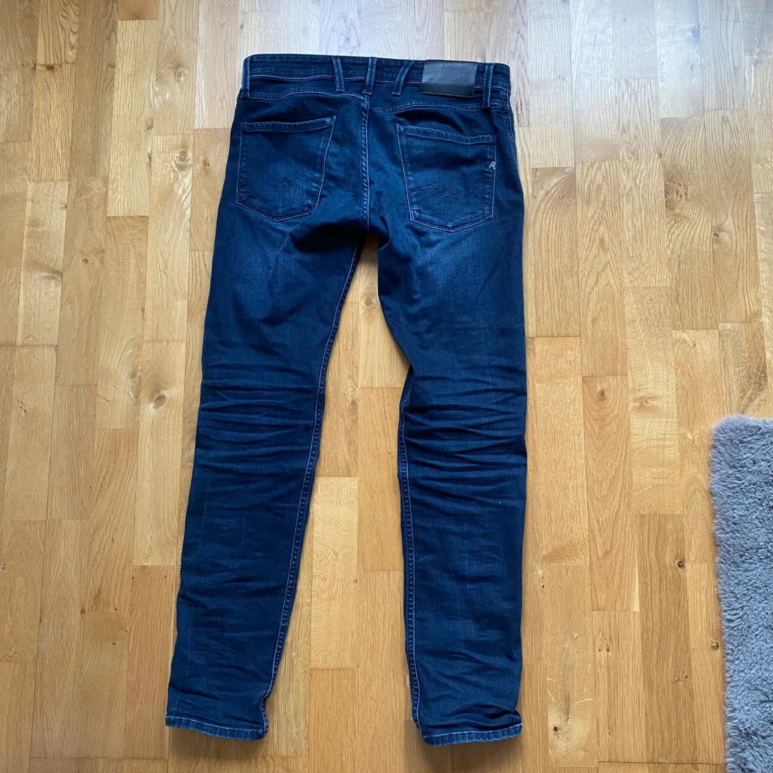 Snygga mörkblå jeans från Replay, modell Anbass. De har en slim passform och klassisk femficksdesign. Perfekta för en stilren look med dragkedja och knapp framtill. Nypris ca 1700. Längd 32