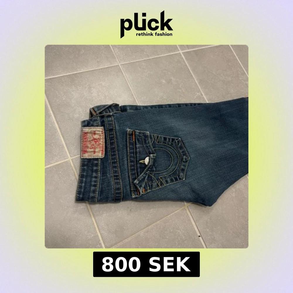 Snygga mörkblå jeans från True Religion med klassisk femficksdesign och orange sömmar. Jeansen har en knappgylf och är i en bootcut-stil som ger en avslappnad look. Perfekta för en casual outfit.