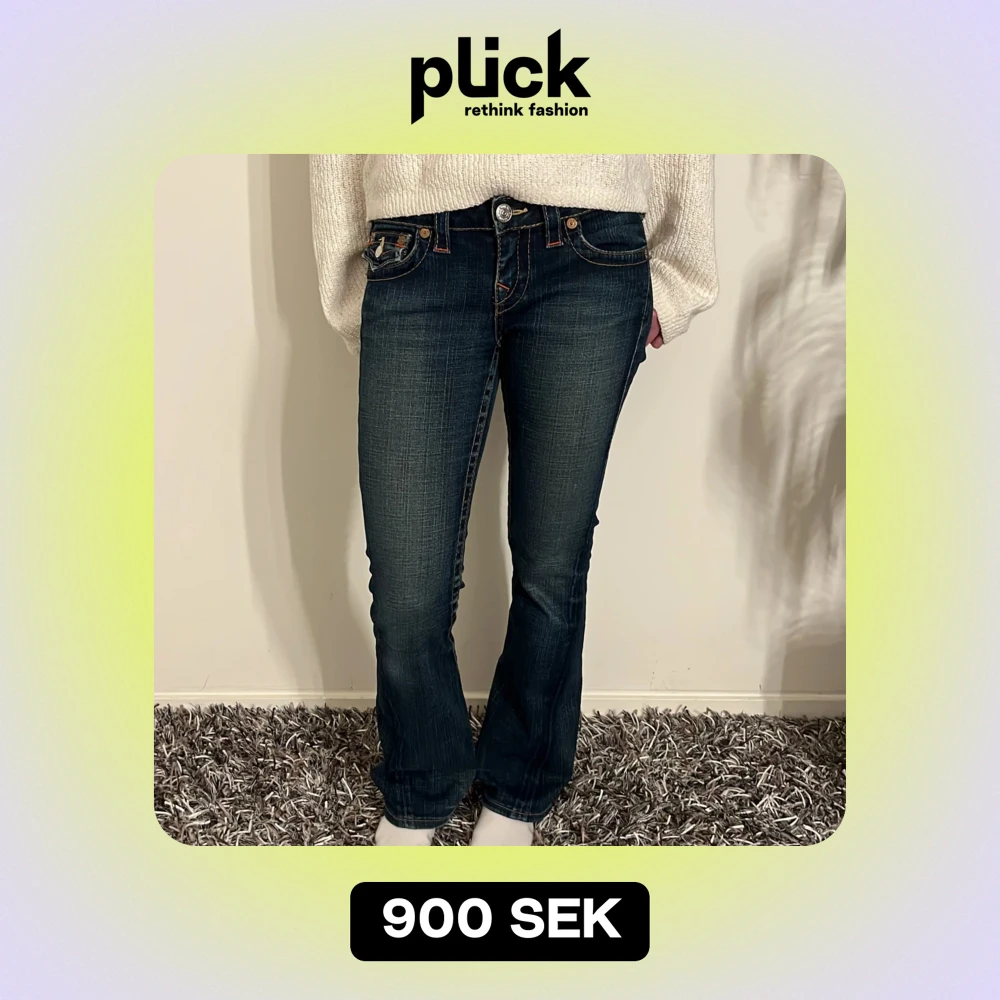 Säljer ett par snygga mörkblå jeans från True Religion i modellen Joey. De har en tight passform med bootcut-stil och är dekorerade med snygga sömmar och knappar på bakfickorna. Perfekta för både vardag och fest! 🕺