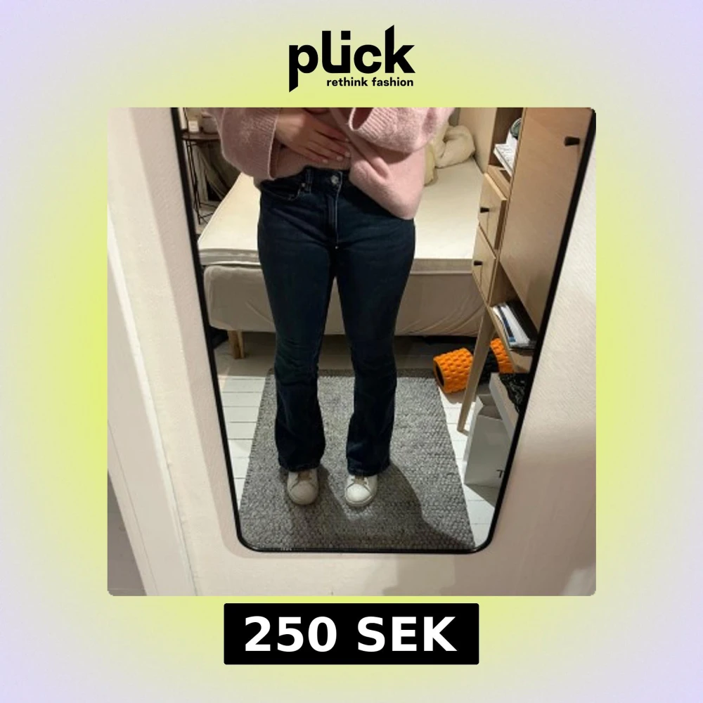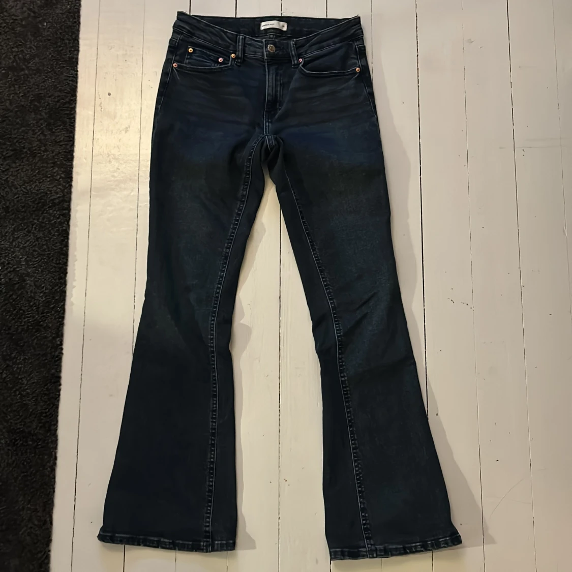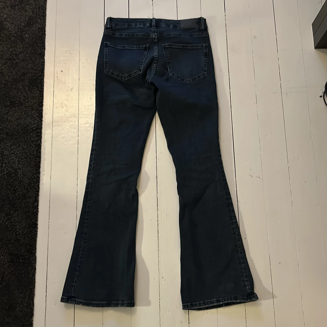 Mörkblåa bootcut jeans från Gina tricot i strl 36. Sparsamt använda och i mycket bra skick. Byxorna har låg midja