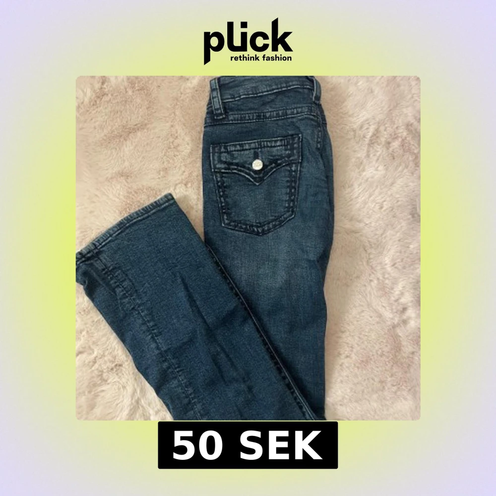 Mörkblå jeans med coola kontrastsömmar och dekorativ bakficka med knapp. Klassisk femficksmodell i mjukt tyg. De är utsvängda. Strl 164 men sitter som XS