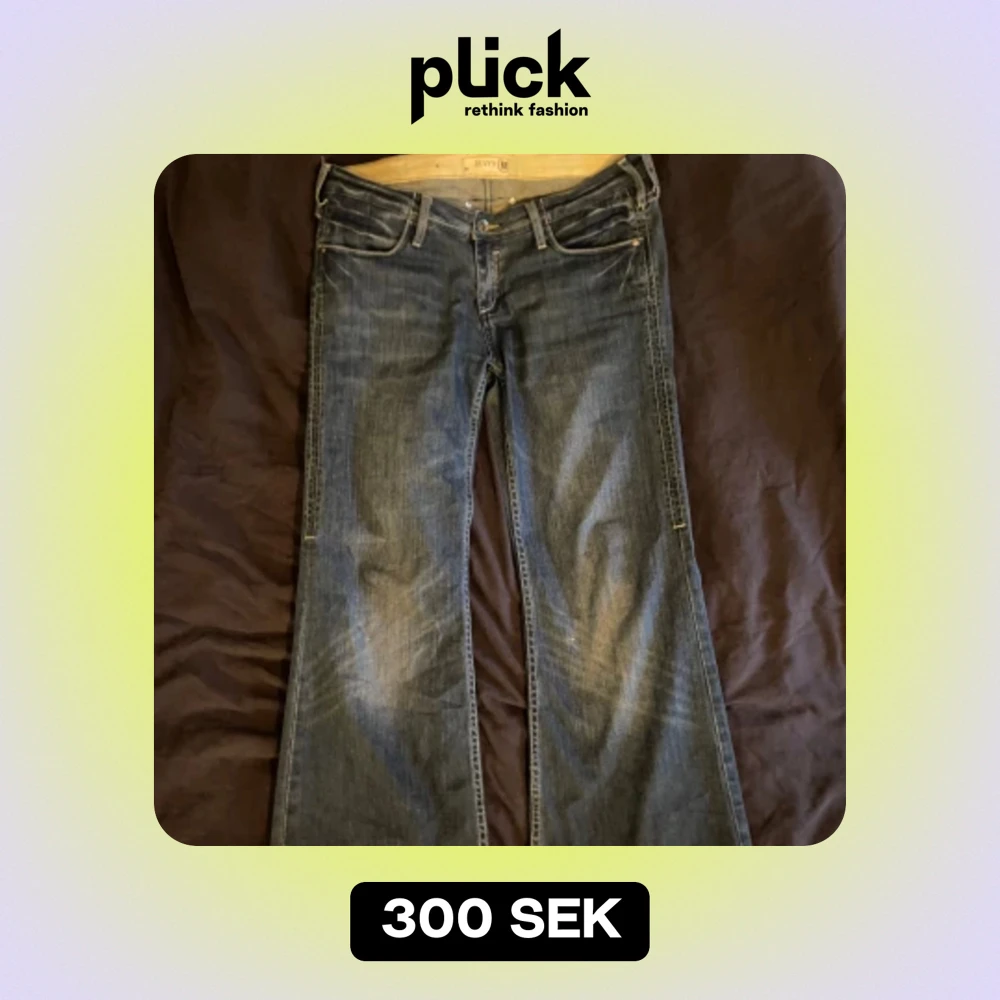 Säljer ett par snygga mörkblå jeans i storlek 40. De har en klassisk bootcut-stil och är perfekta för en avslappnad look. Jeansen har en knapp och dragkedja framtill samt fickor både fram och bak. De är i bra skick med lite slitage vid fållen, vilket ger dem en cool vintage-känsla.