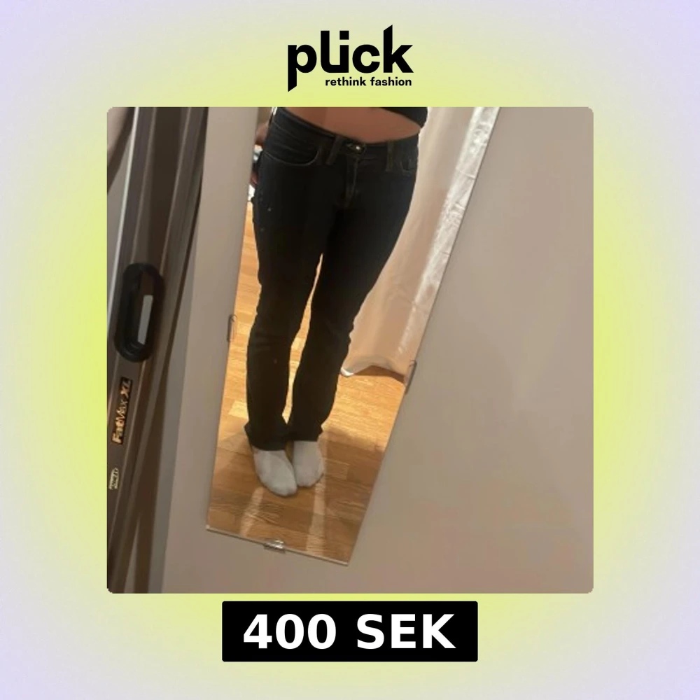 Snygga mörkblå jeans med bootcut-stil och låg midja. Perfekta för en avslappnad look. Klassisk design med fem fickor och knappgylf.