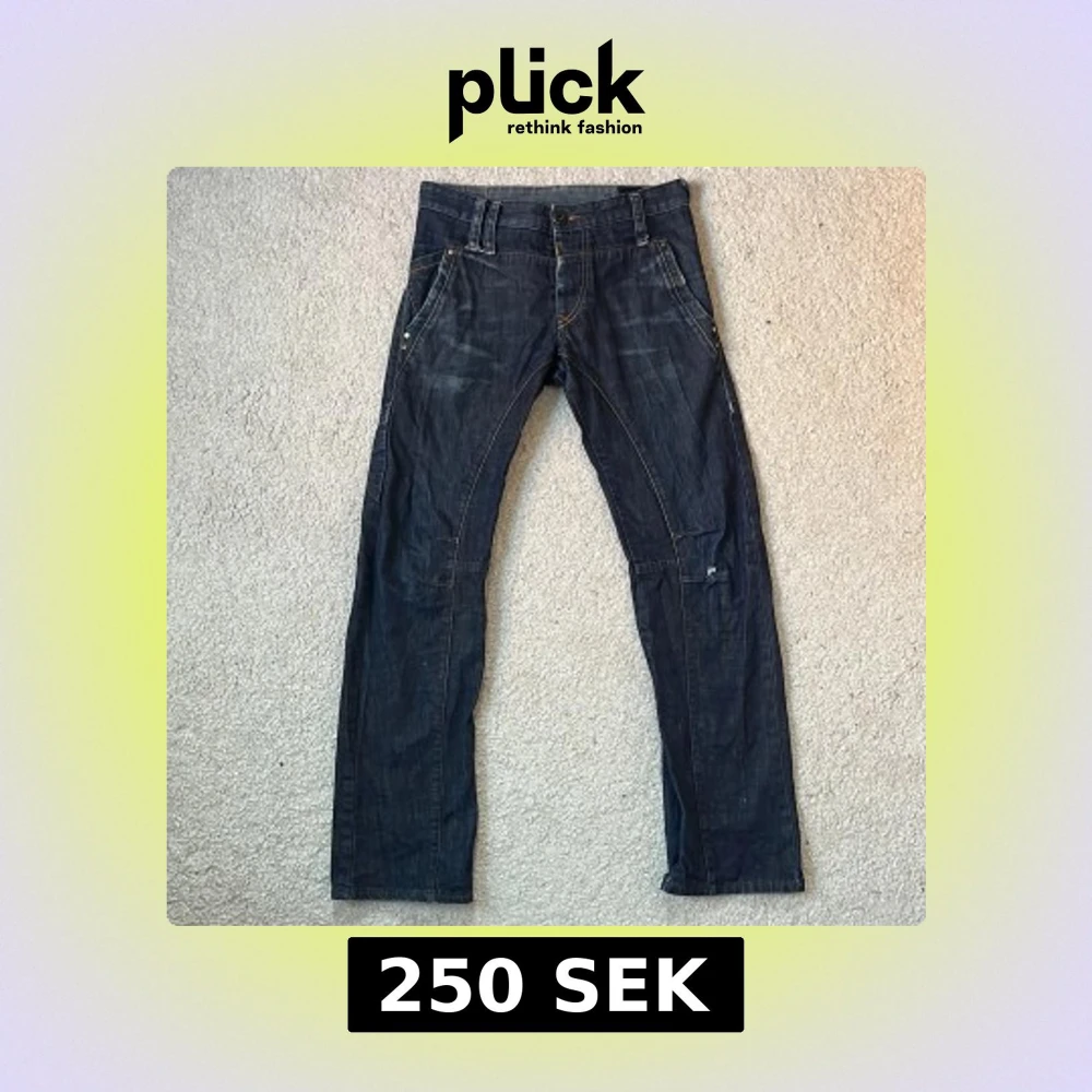 Snygga mörkblå jeans med unika sömmar och detaljer. De har en klassisk femficksdesign och en justerbar rem på baksidan. Perfekta för en stilren look.