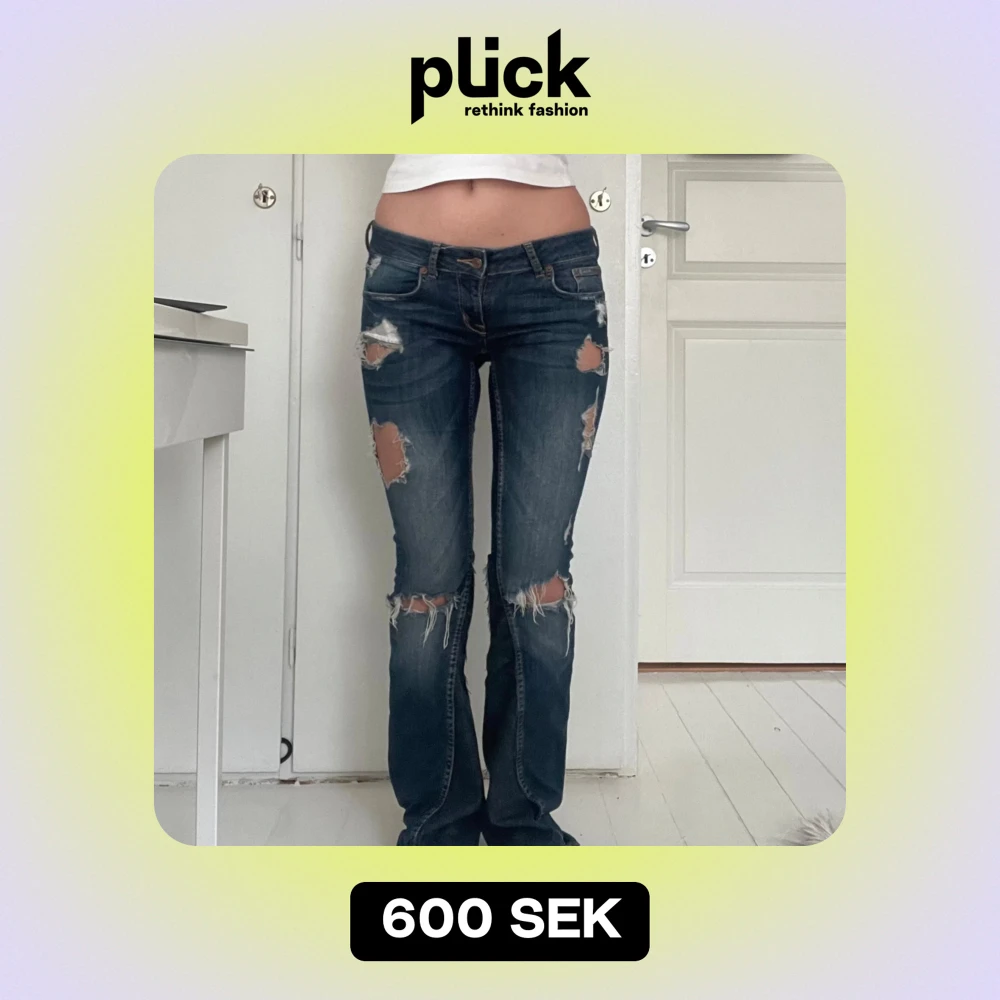 Såå coola utsvängda jeans med hål! Mycket bra skick. Modellen är 159 cm lång, midjemått 40 cm, innerbenslängd 80 cm. Jeansen är utsydda