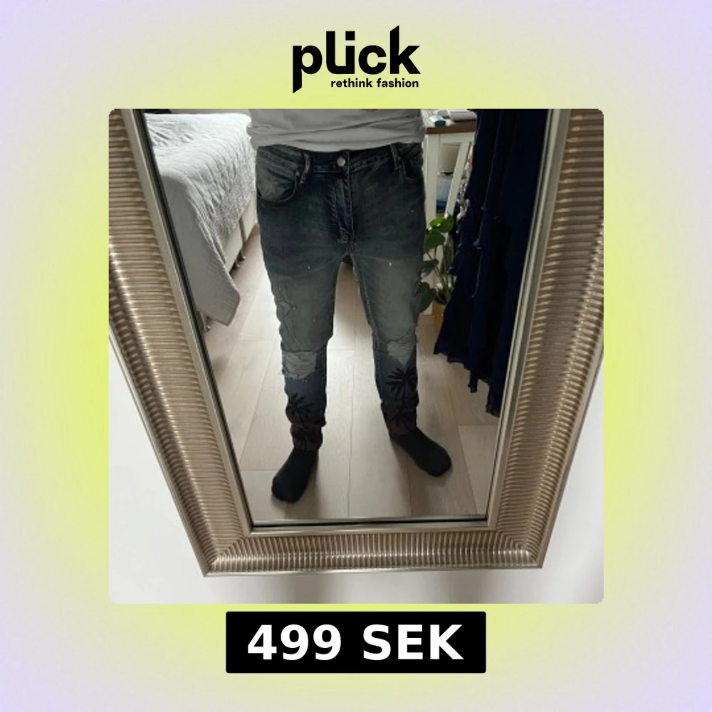 Säljer ett par mörkblå jeans med unikt palmtryck nertill på benen. Jeansen har normal passform, klassisk femficksdesign och dragkedja. Perfekta för dig som vill sticka ut lite extra med din stil.
