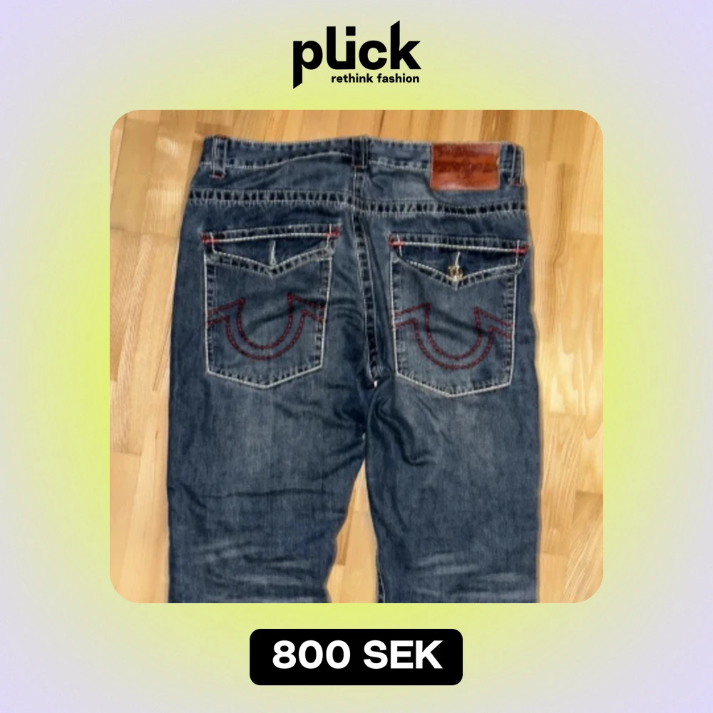 Blåa True Religion Ricky SuperT med röd stitching, saknas en knapp på vänster bakficka.