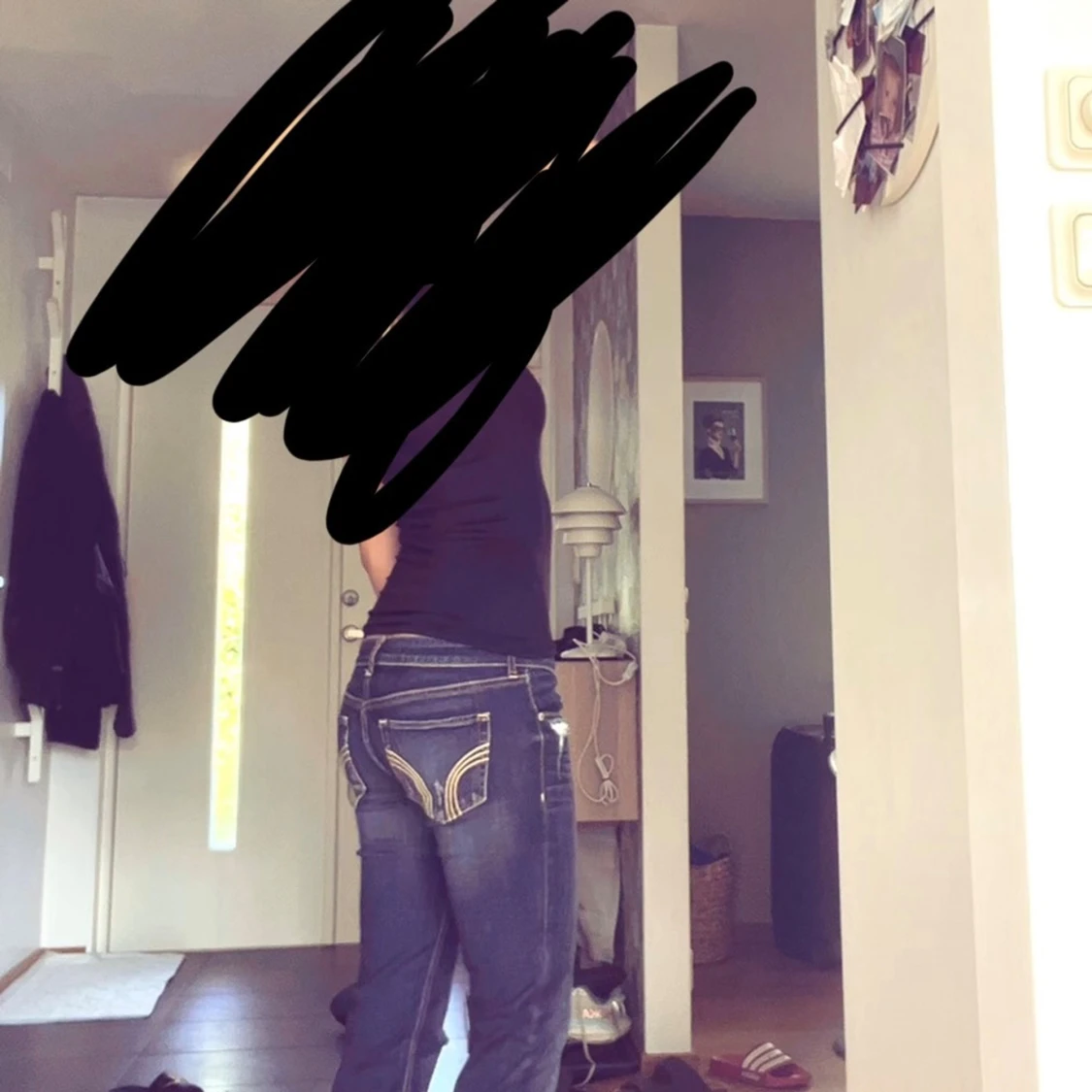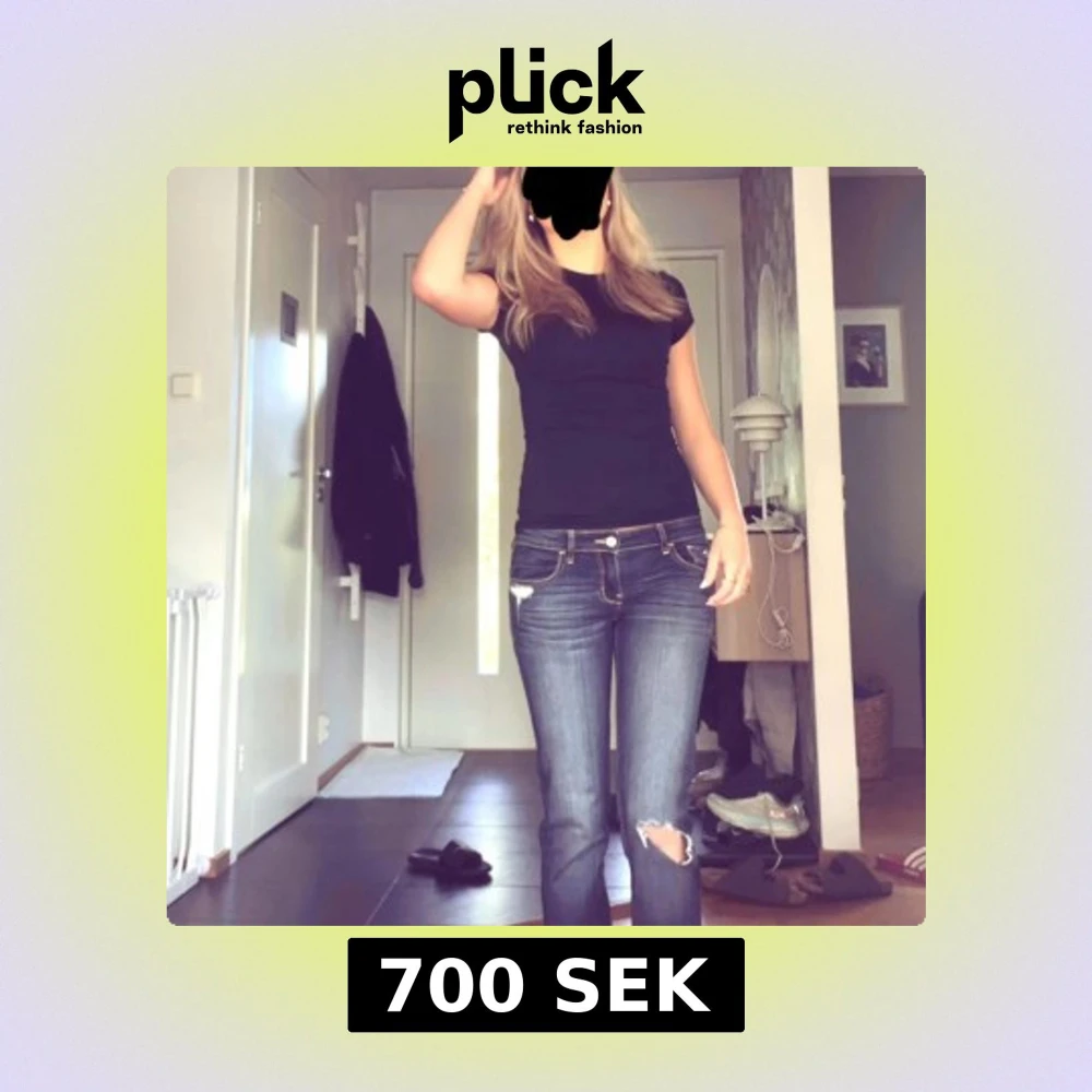 Säljer ett par mörkblå jeans med snygga slitningar på låret och detaljerade bakfickor med kontrastsömmar. Jeansen har låg midja och klassisk femficksmodell. Perfekta för dig som gillar en avslappnad och trendig look.