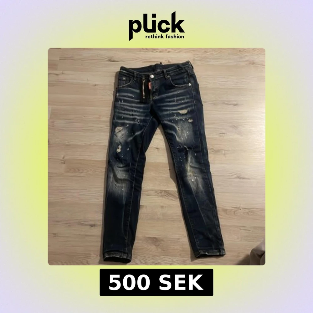Snygga mörkblå jeans med coola slitningar och färgstänk. De har en klassisk femficksdesign och knappgylf. Perfekta för en avslappnad stil med en edgy touch. Storlek 152-164