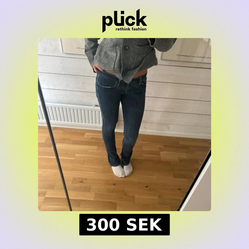Snygga mörkblå jeans från Levis med låg midja. Byxan har slits längst ner. Liten i storleken, jag har vanligtvis 25 och är 176cm lång, men dessa i 28 passar mig💕💕