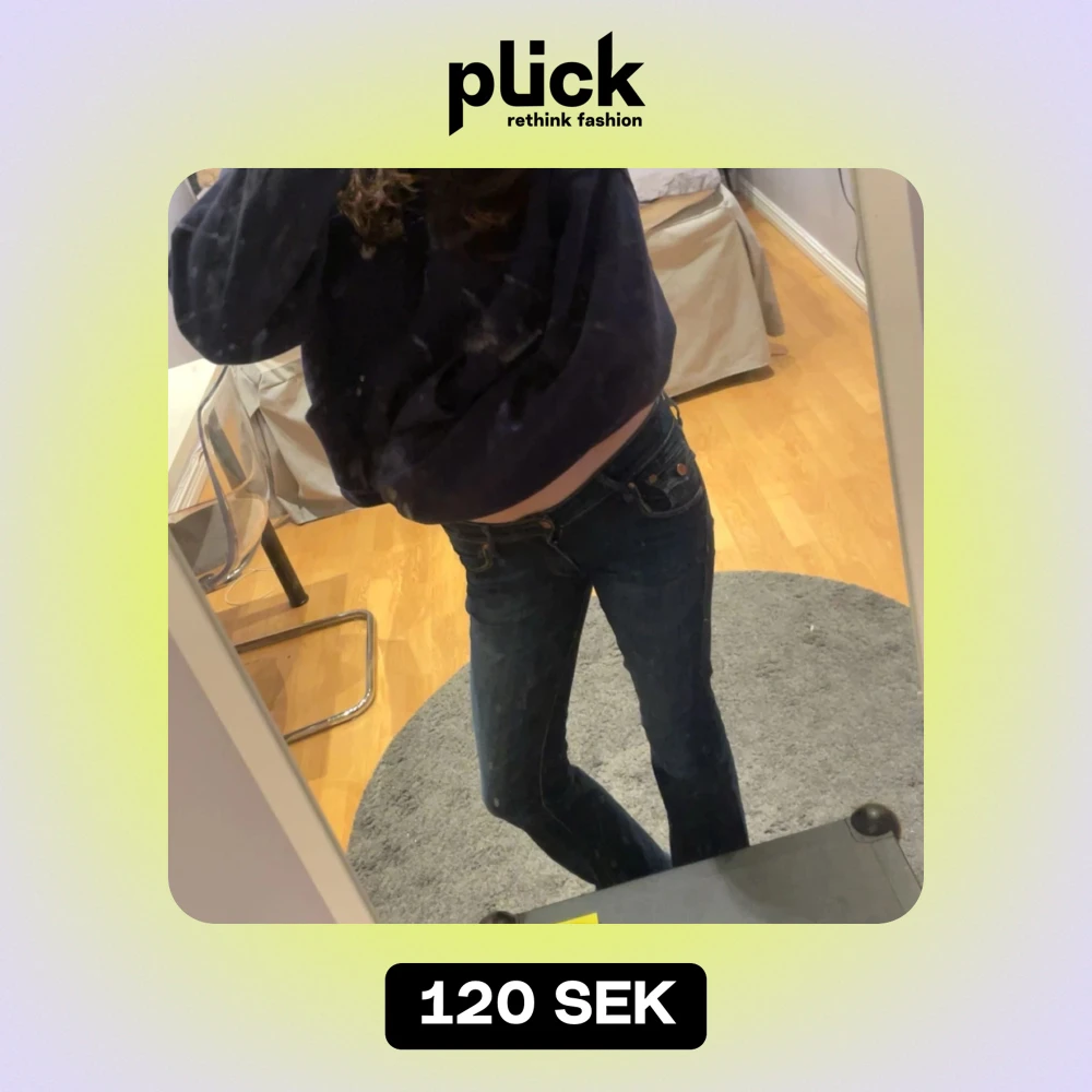 Säljer ett par mörkblå jeans med klassisk femficksdesign och knappdetaljer. Perfekt för en avslappnad stil.