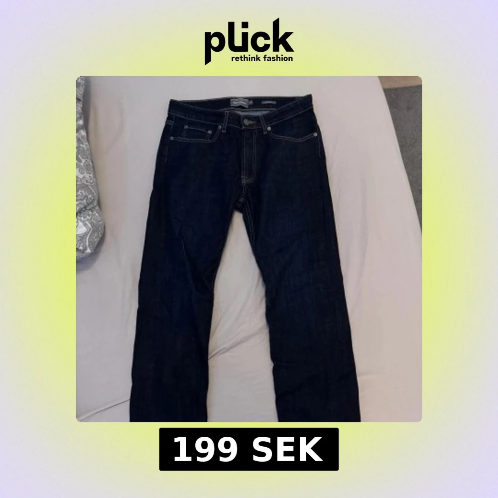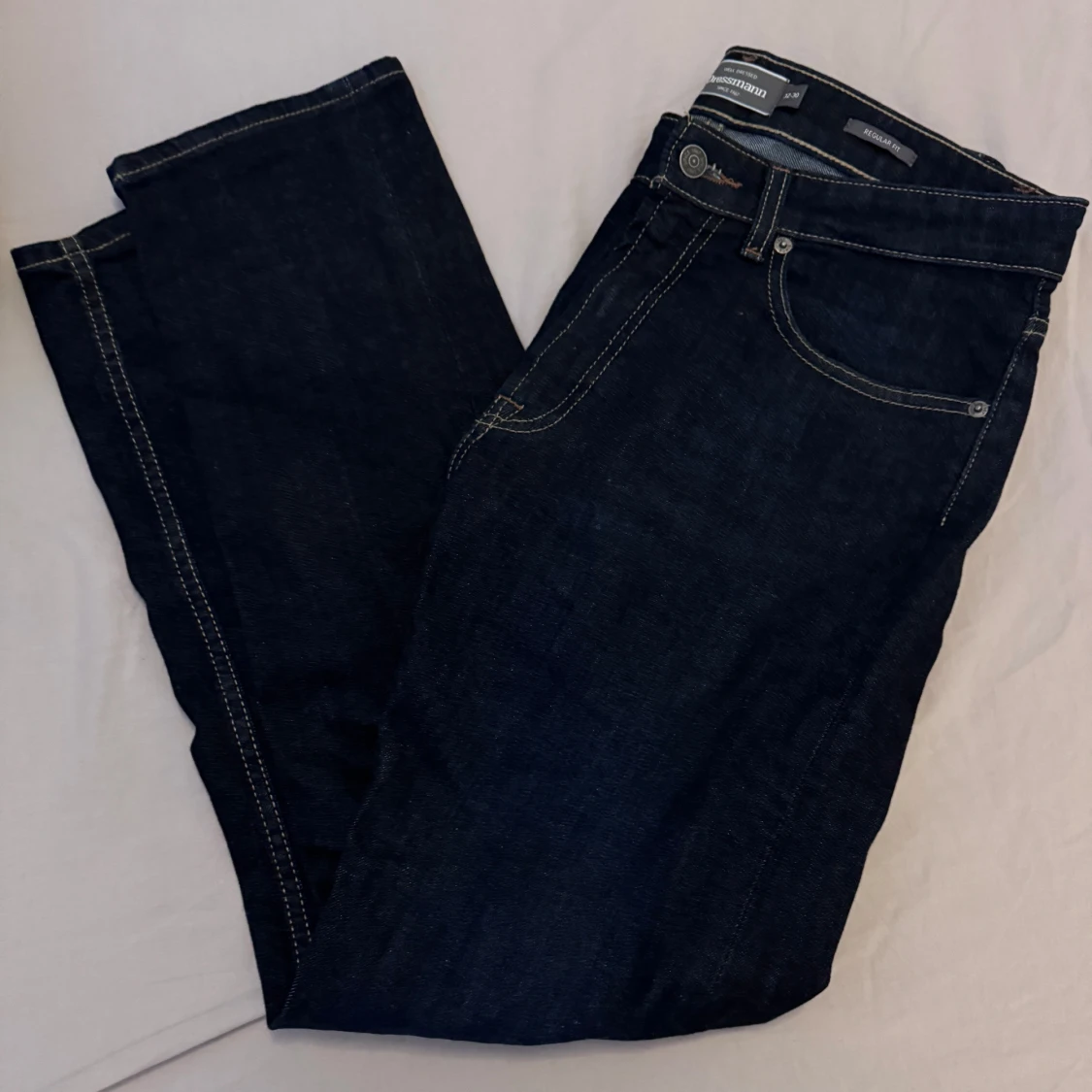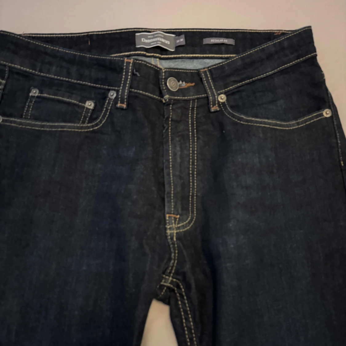 Snygga mörkblå jeansbyxor från dressman med klassisk femficksdesign och kontrastsömmar. Perfekta till vardags och har en rak passform som funkar till det mesta. Stängs med dragkedja och knapp. Storlek W32/L30
