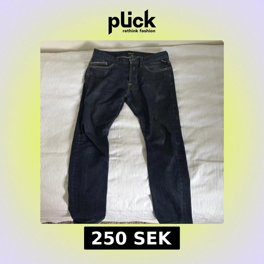 Säljer mörkblå Replay jeans använda ett par gånger men köpte de begagnade så de e lite slitna vid fickorna. Säljer de pga tröttnat på de och vill köpa nytt.