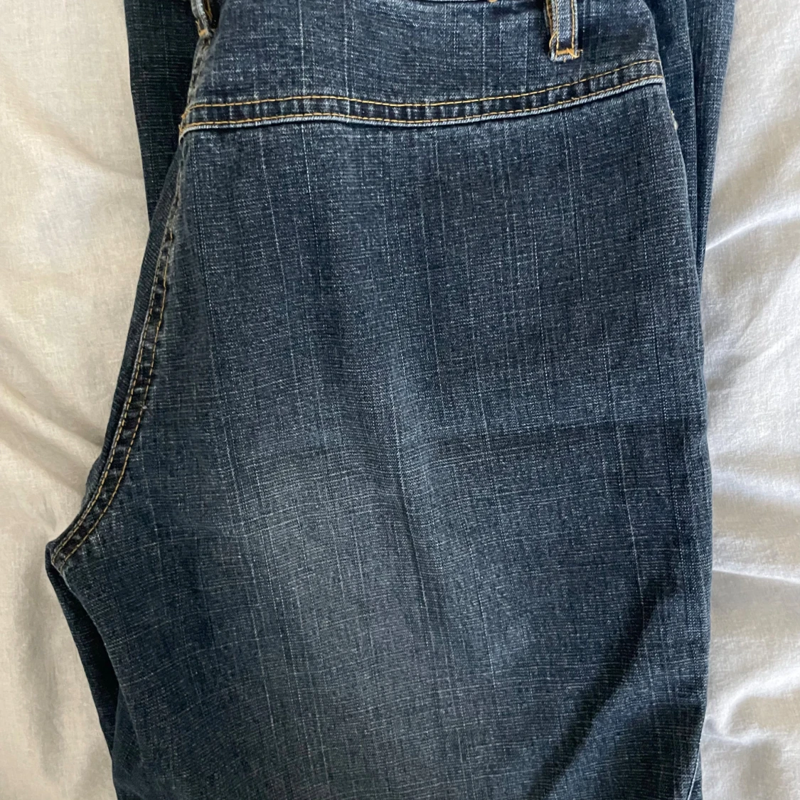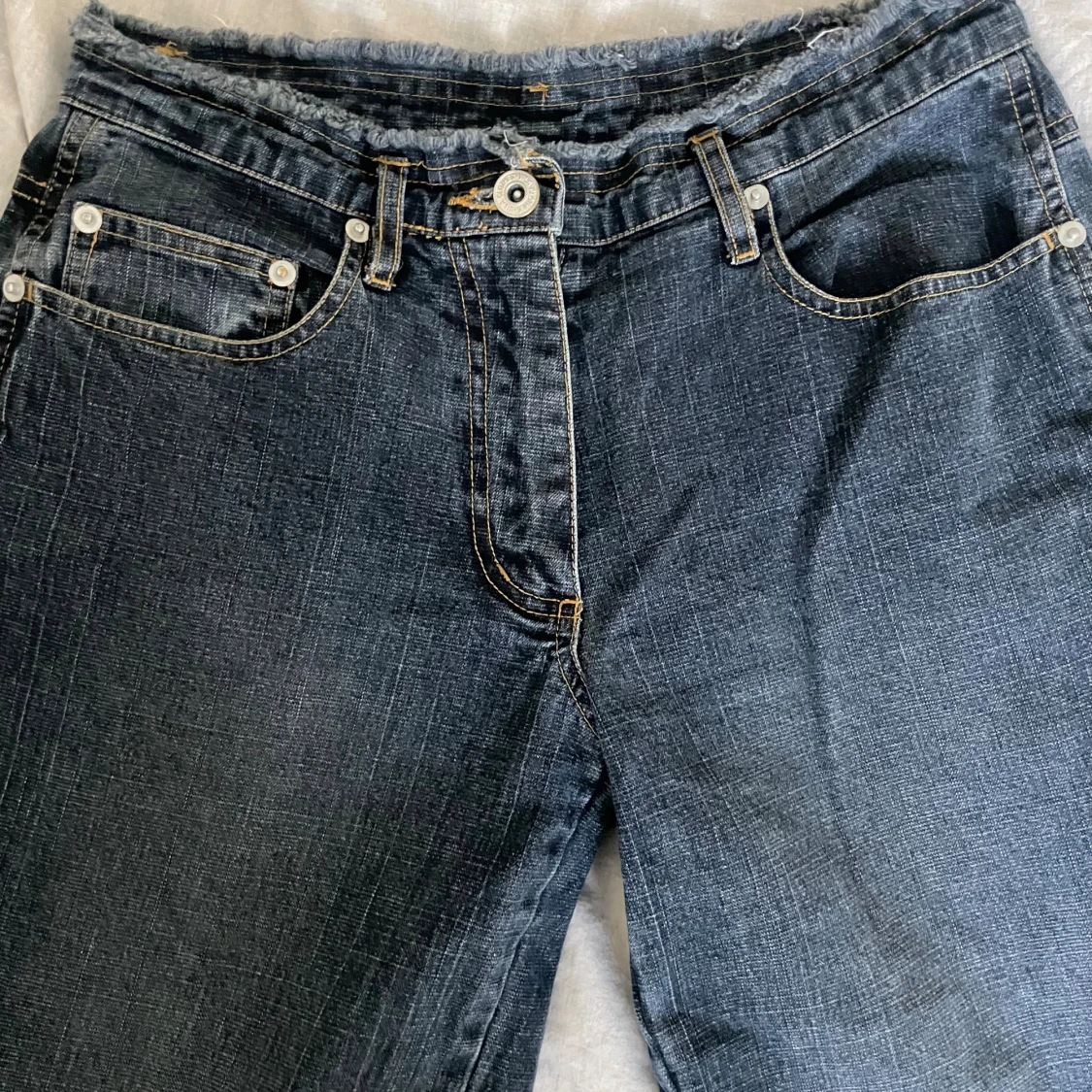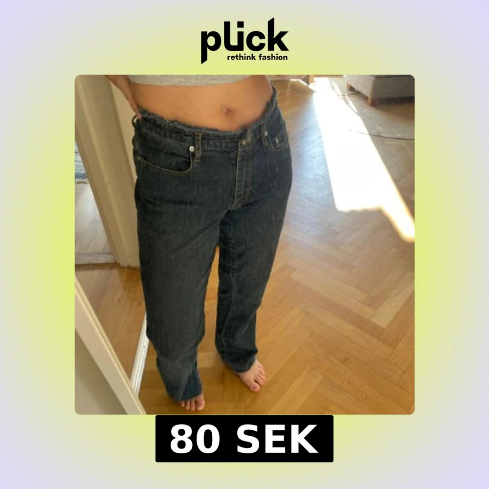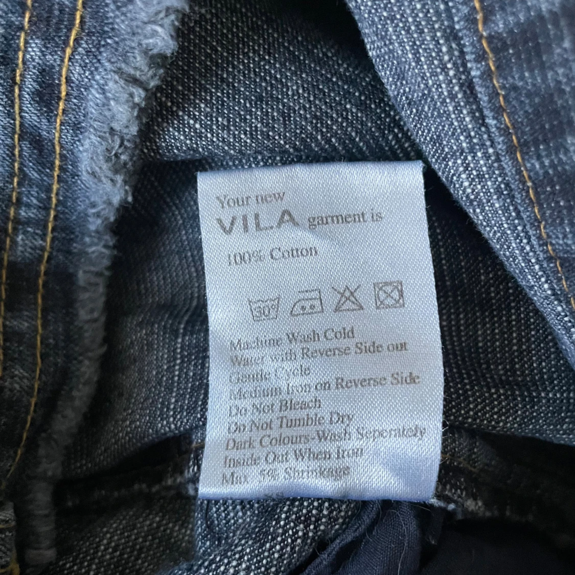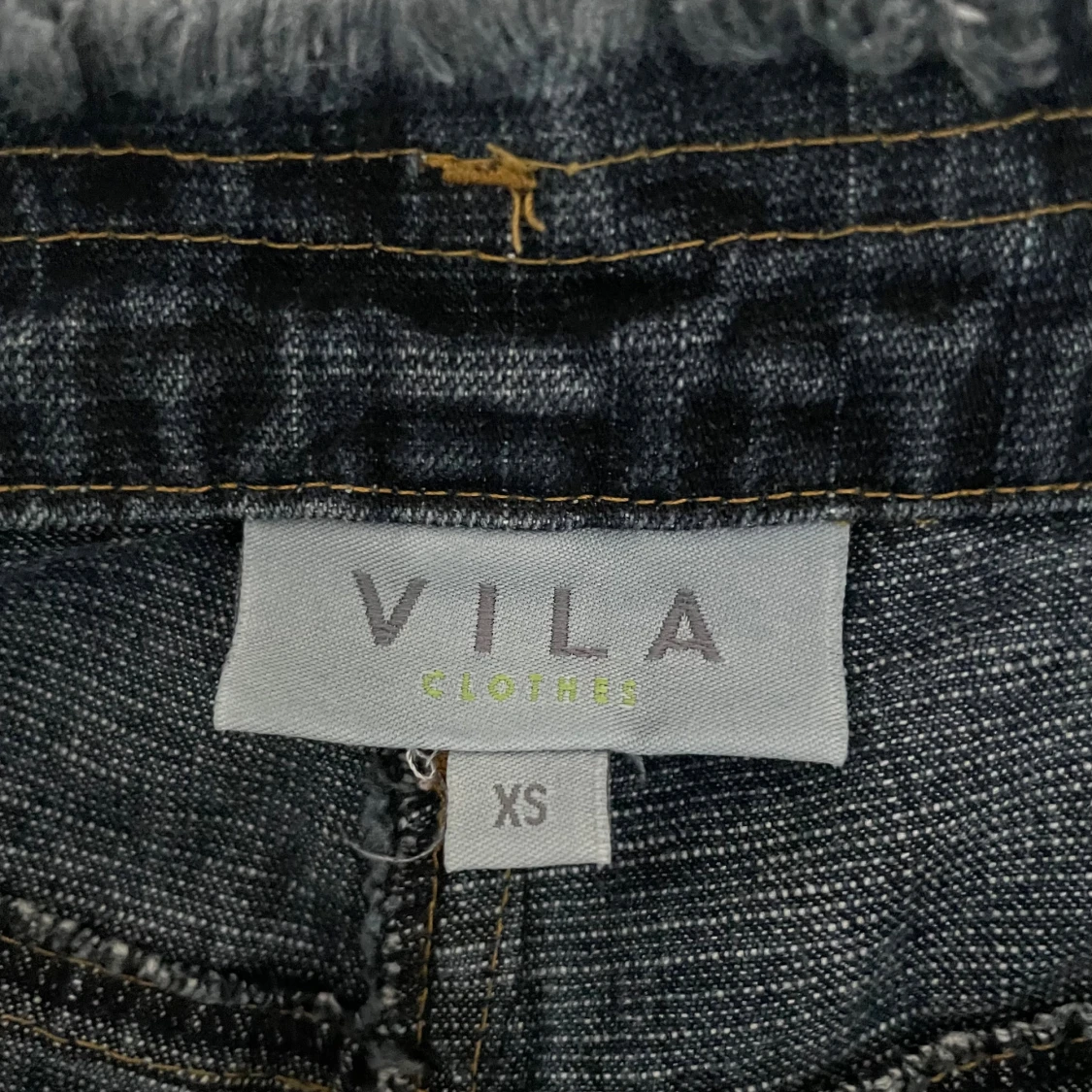 Säljer ett par mörkblå jeansbyxor från Vila i storlek XS. Byxorna har rå kant upptill i midjan, klassiska fem fickor och raka ben. Jeansen har kontrastsömmar och är tillverkade i ett mjukt denimtyg som känns skönt att bära.