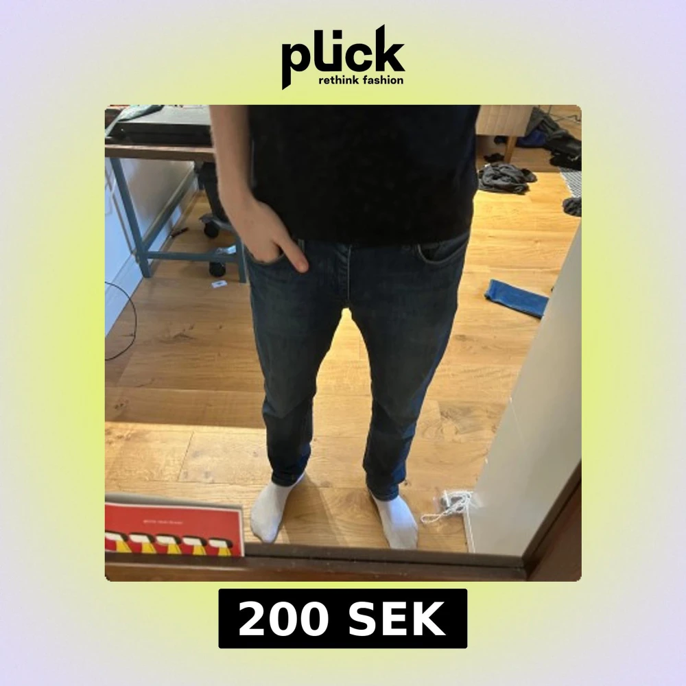 Säljer ett par klassiska mörkblå jeans med normal passform och raka ben. Jeansen har fem fickor och stängs med dragkedja och knapp. Perfekta för en stilren vardagslook.