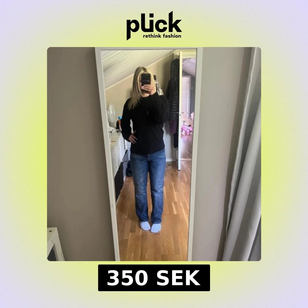 Säljer ett par mörkblå jeansbyxor midrise midja och är ”baggy”. Byxorna har synliga knappar framtill och klassiska fickor både fram och bak. Det blir ljusare vid knäna super fina!