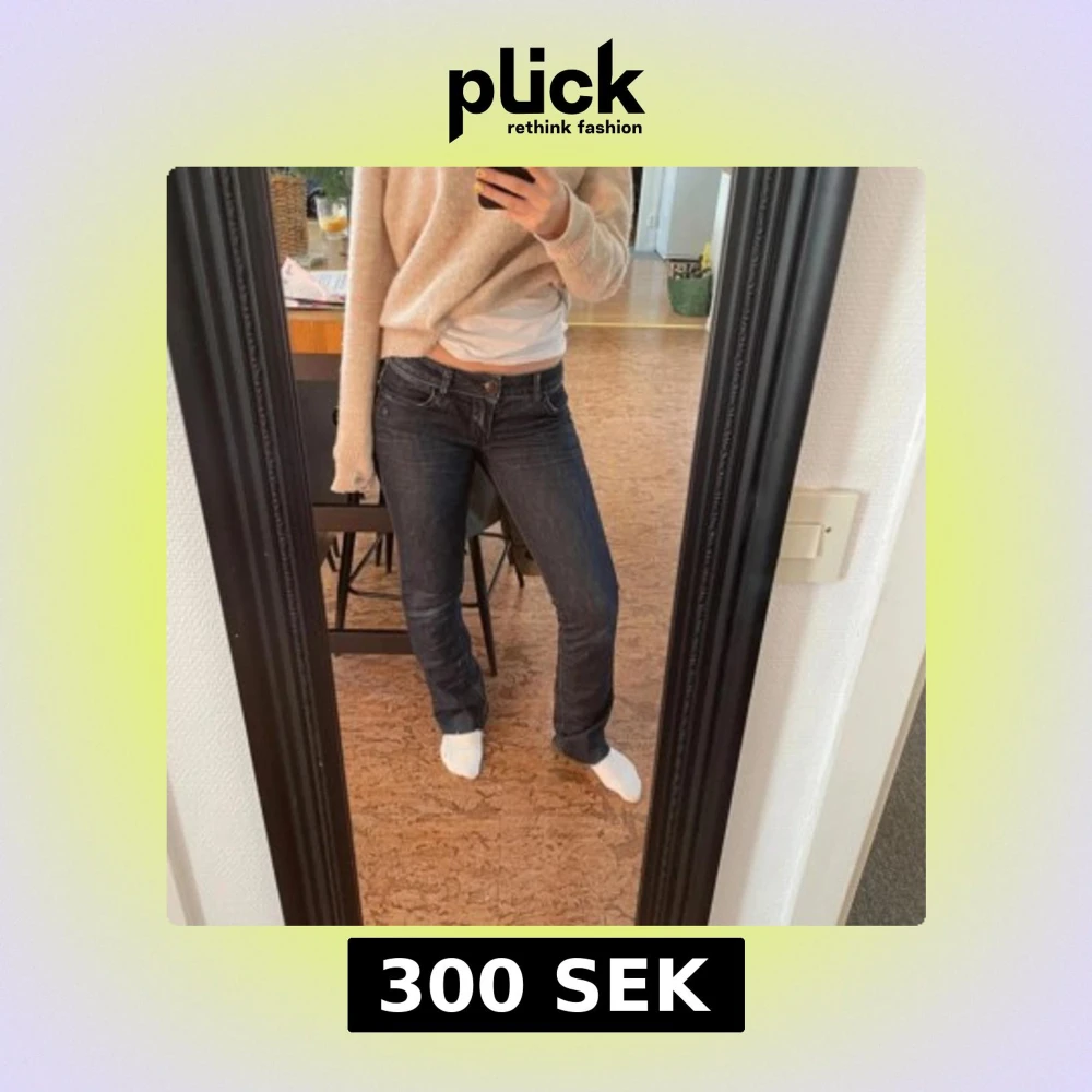 Säljer ett par klassiska mörkblå jeansbyxor med normal passform och bootcut. Byxorna har låg midja, fem fickor och stängs med dragkedja och knapp. Perfekta till vardags och lätta att matcha med olika toppar.