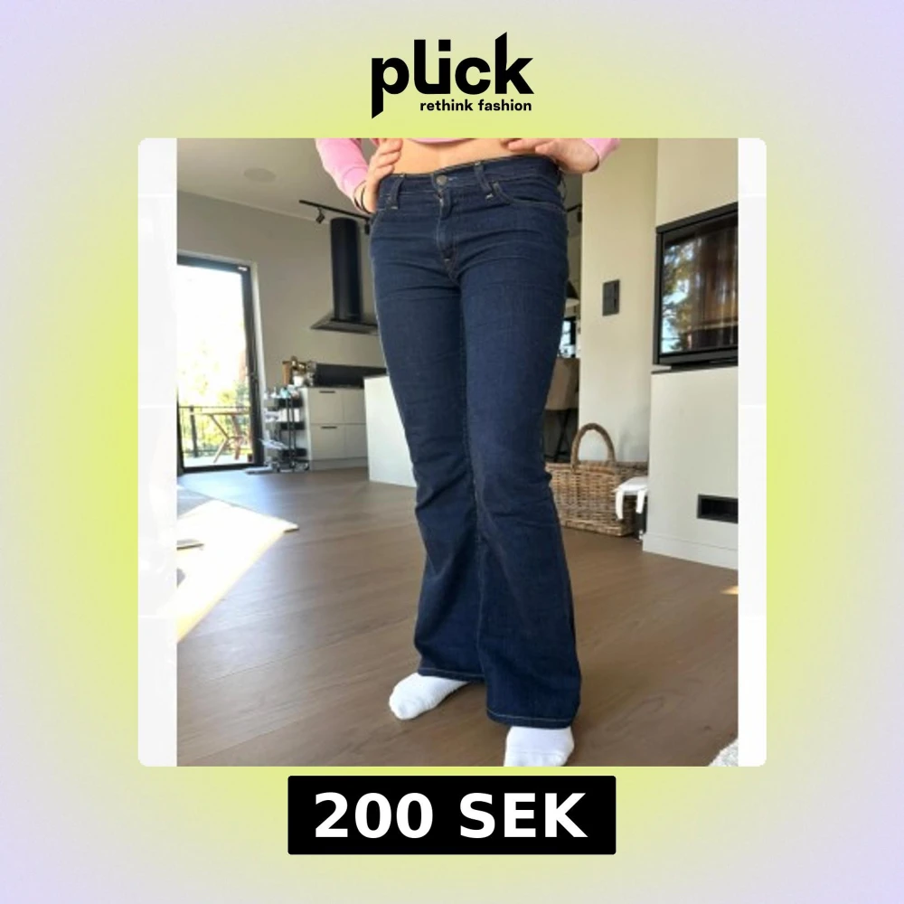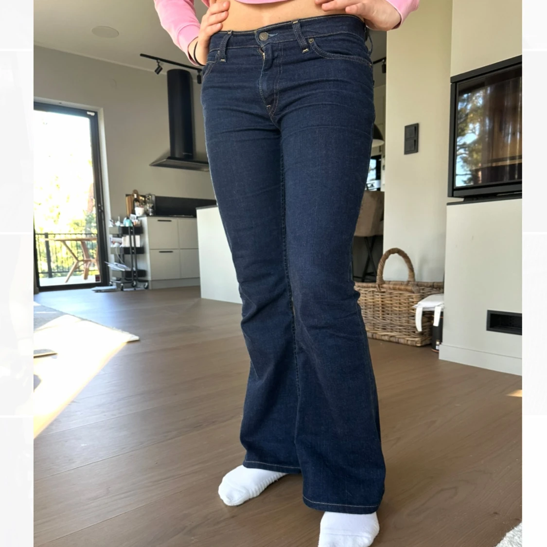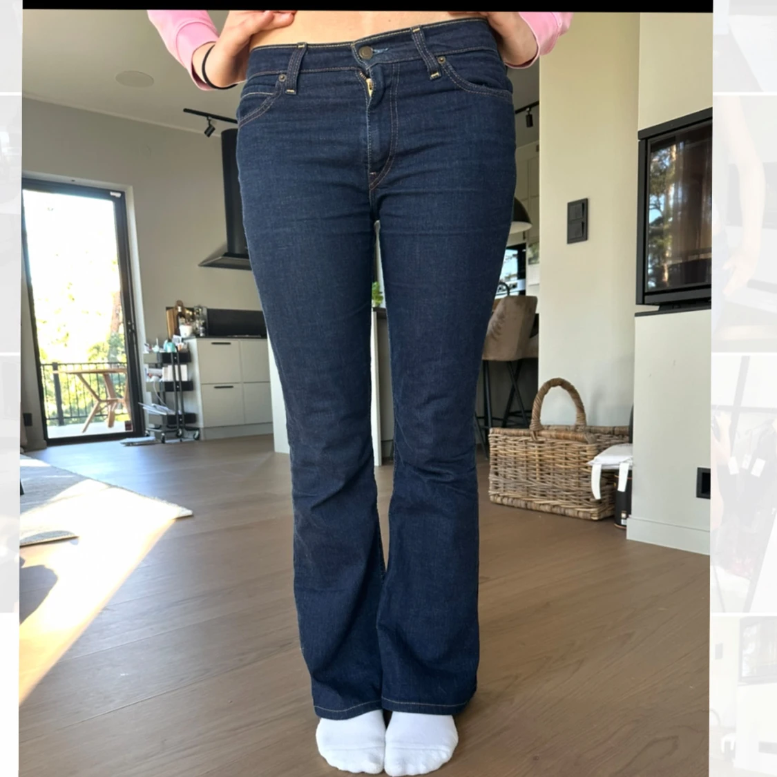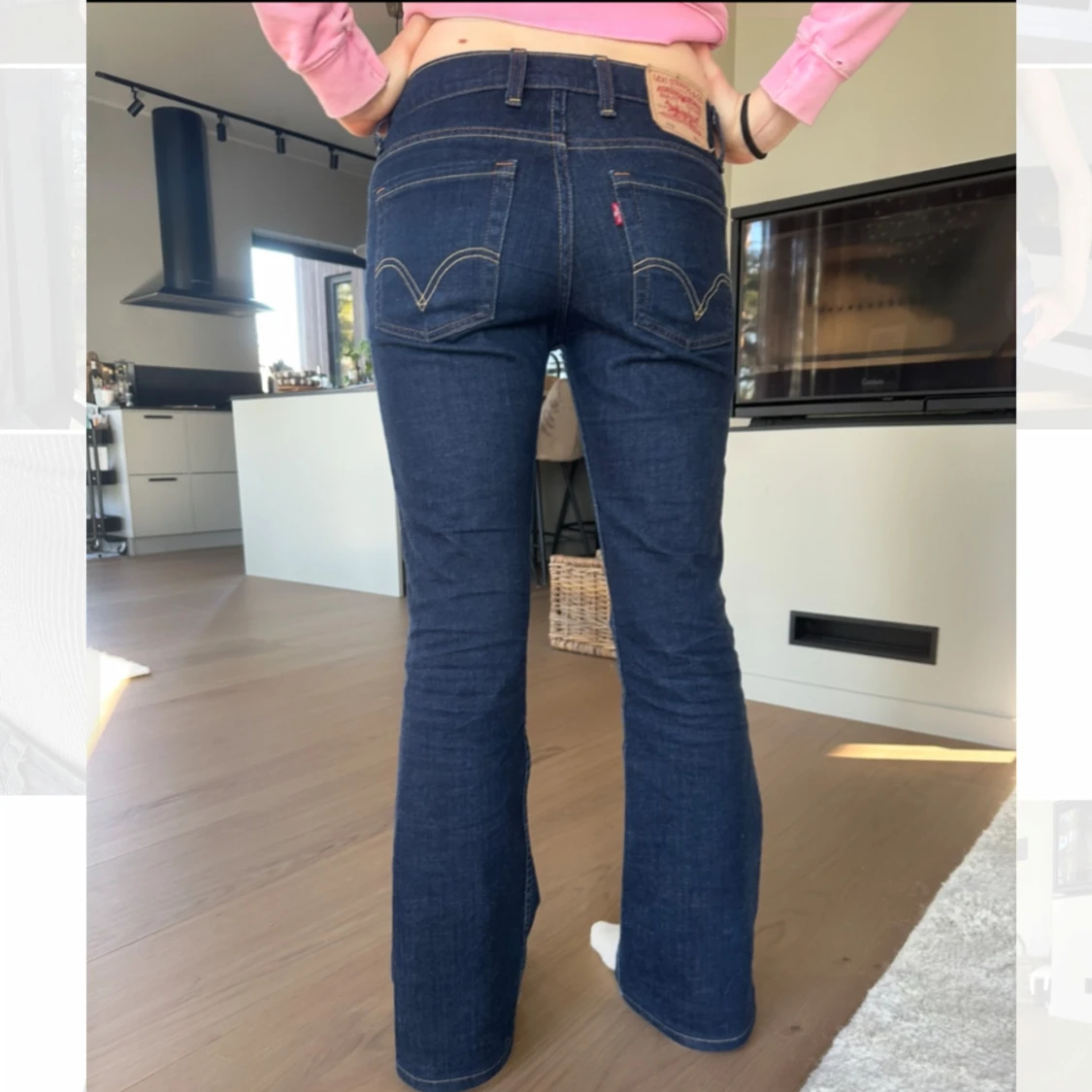 Säljer ett par mörkblå jeans från Levi's med klassisk bootcut-passform. Jeansen har fem fickor, gylf med dragkedja och knäppning samt tydliga sömmar baktill. Perfekta för dig som gillar en tidlös jeanslook. Längden är original 34 men har sytt upp dom så de passar snare 32
