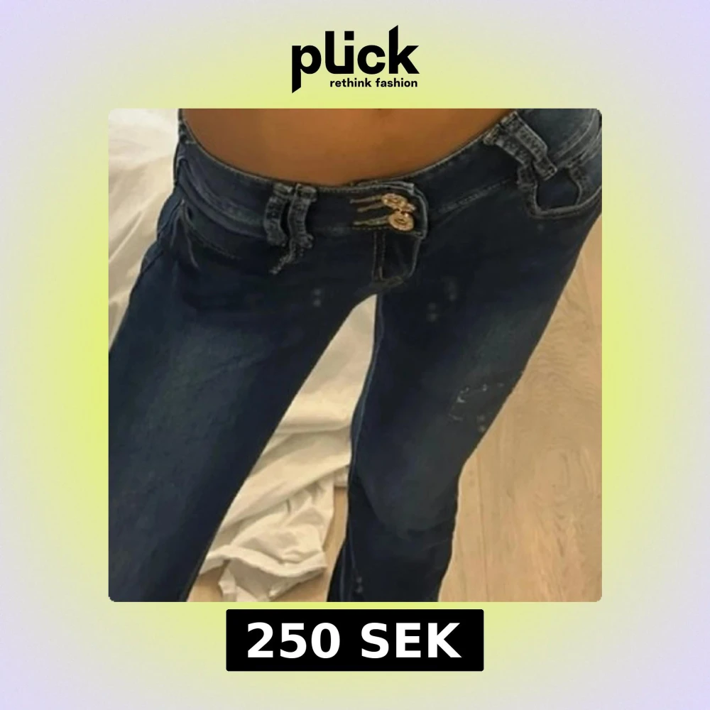 Snygga mörkblå jeans med låg midja och unika detaljer som dubbla knappar i guld och ett litet hjärta på bakfickan. Jeansen har klassisk femficksdesign och är tillverkade i stretchigt denim för skön passform. Storlek xs