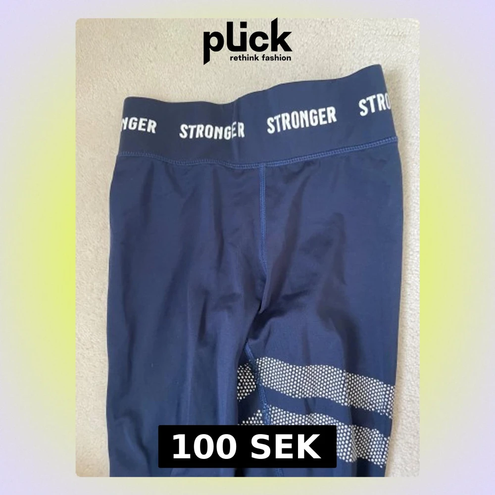 Snygga mörkblå leggings från Stronger med vit logga på midjan och coola prickiga detaljer på ena benet. Stretchigt material som sitter tight och är perfekt för träning.