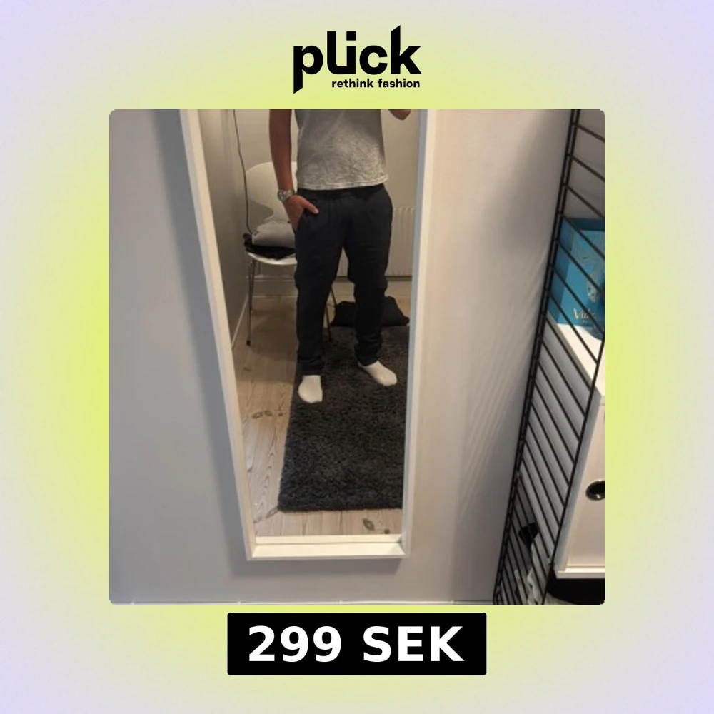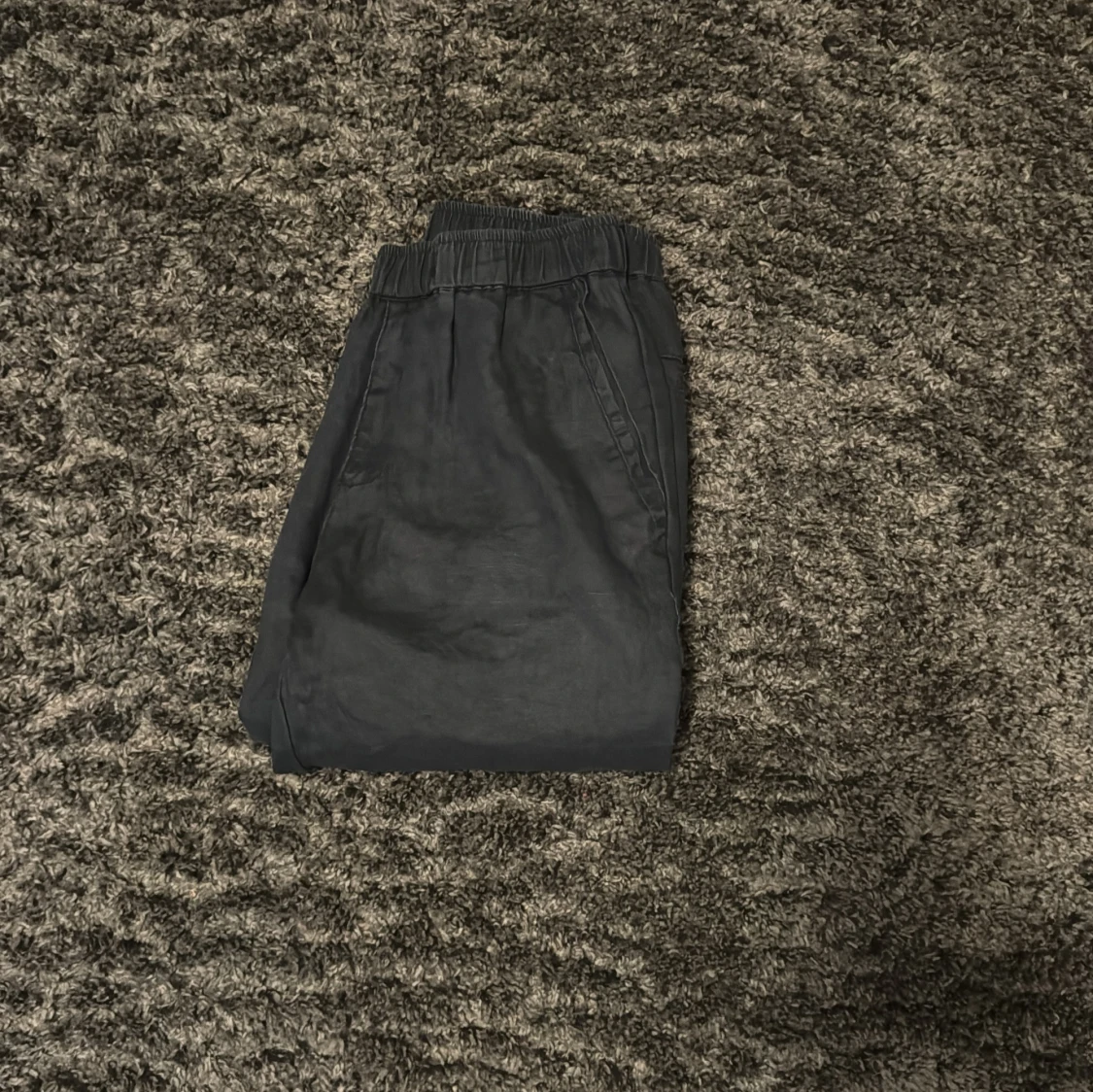 Säljer ett par mörkblå linnebyxor med avslappnad passform och elastisk midja. Byxorna har sidfickor och är perfekta för en chill och stilren look. Lätta och sköna, passar grymt till både t-shirt och skjorta.