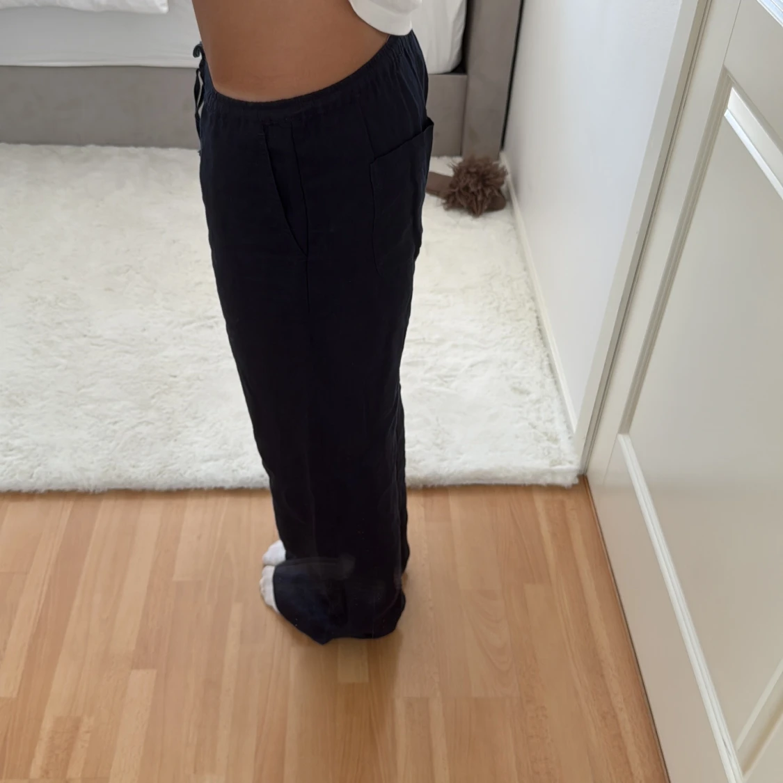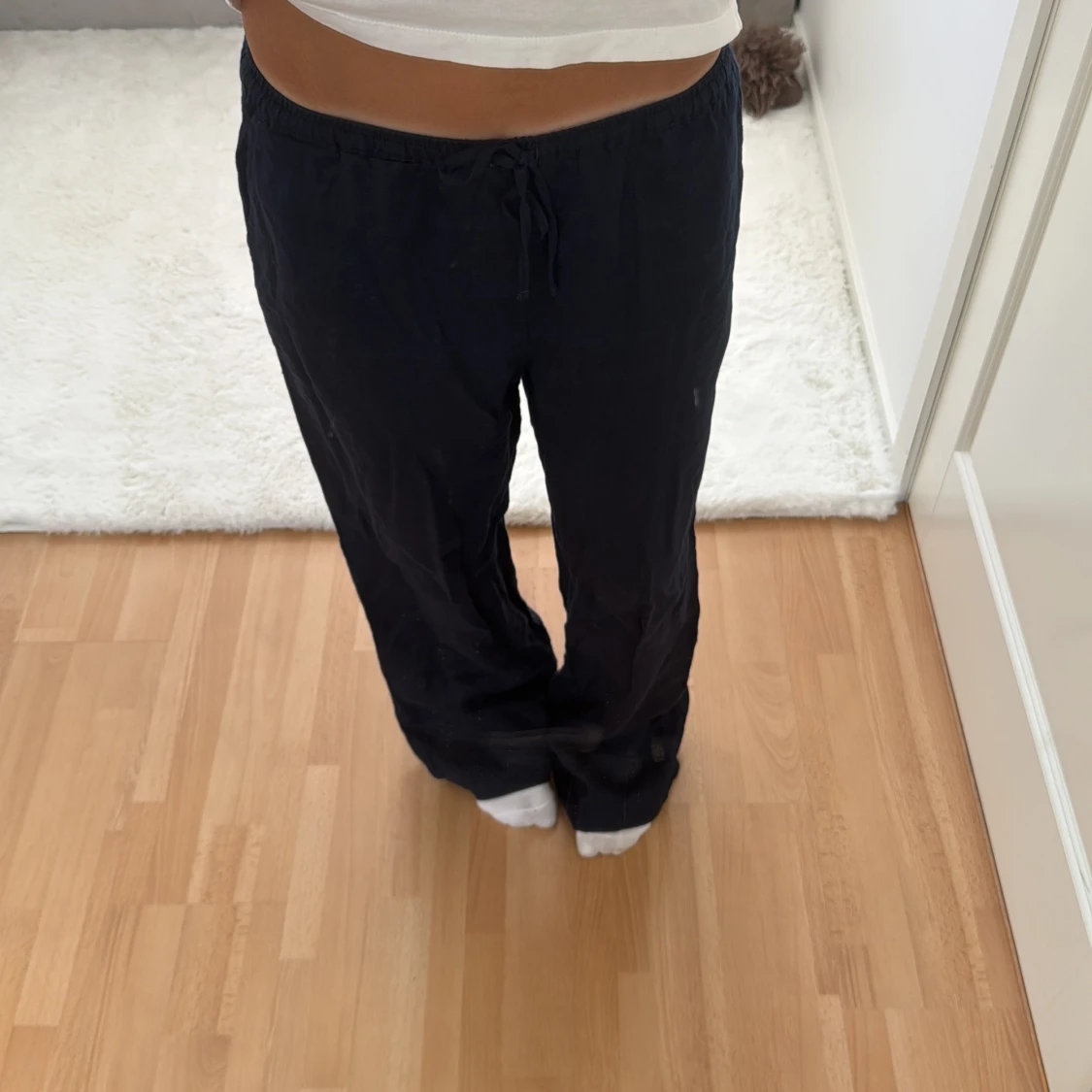 Snygga mörkblå linnebyxor med avslappnad passform och raka ben. Byxorna har elastisk midja med snörning och praktiska fickor på sidorna. Storlek s, referens jag är 169 cm lång. Ordinarie pris 500