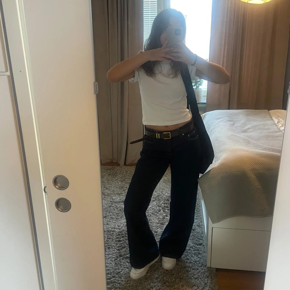 Säljer ett par mörkblå jeans från Gina tricot i storlek 36. Modellen är low waist wide leg. Använd 1-2 gånger. Populär slutsåld modell. Jättefin färg till hösten!💕