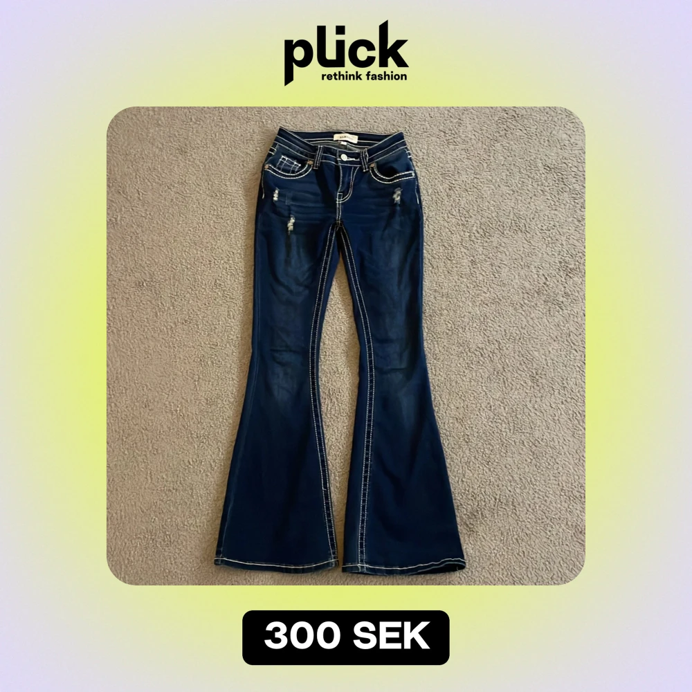 Säljer ett par snygga mörkblå lowaist bootcut jeans från Bamboo med glitter på fickorna . Jeansen är i storlek 0 som motsvarar storlek 32. De är köpta i USA och säljer för att de är för små för mig. De är inte jätteanvända, kontakta mig om ni vill ha fler mått💗.