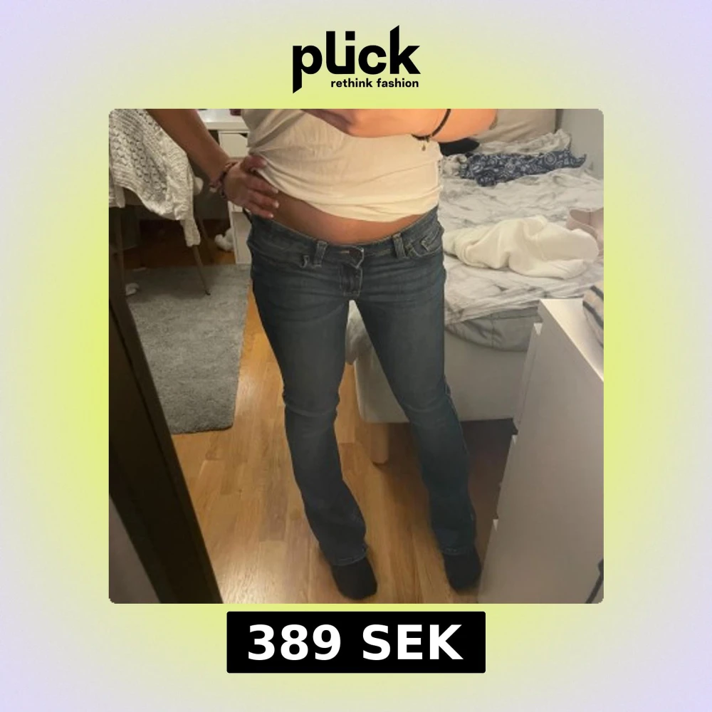 Skitsnygga bootcut marinblå jeans från Hollister köpta i USA, med låg midja och mönster på bakfickorna!! För referens är jag 165 cm och midjestrl W24-25