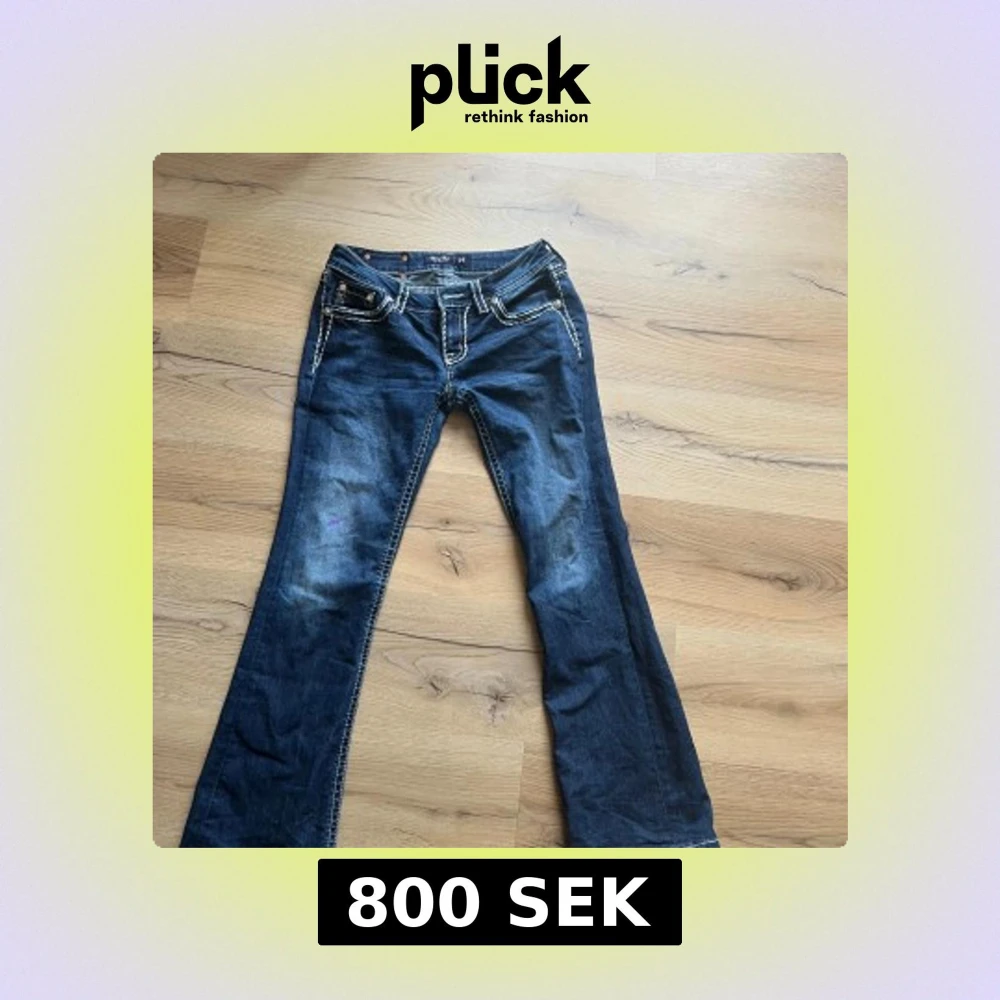 Snygga mörkblå jeans från Miss Me med tydliga kontrastsömmar och broderade bakfickor. Bootcut-modell med klassisk femficksdesign och lila detalj på ena benet. Jeansen har låg midja och är tillverkade i stretchig denim för skön passform. En liten lila fläck som inte syns på håll
