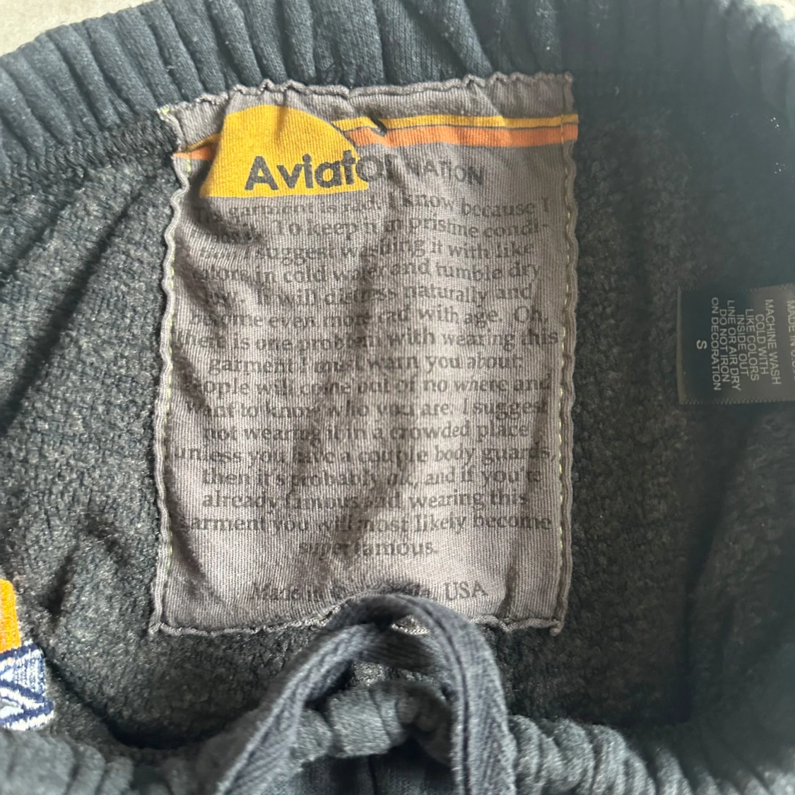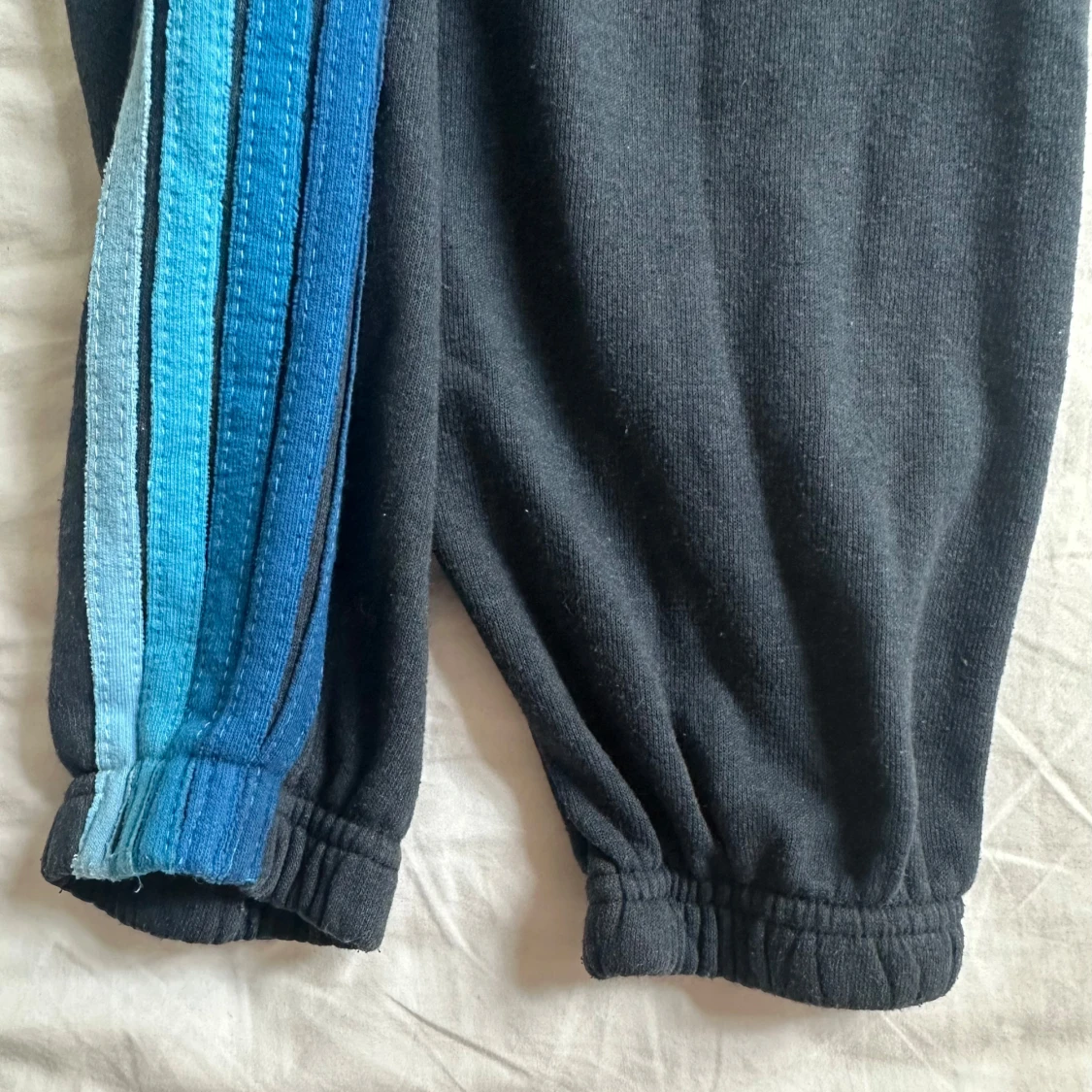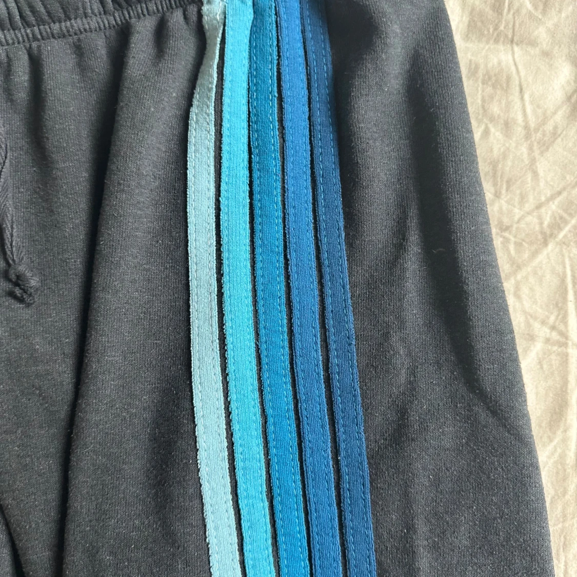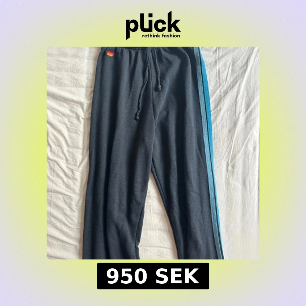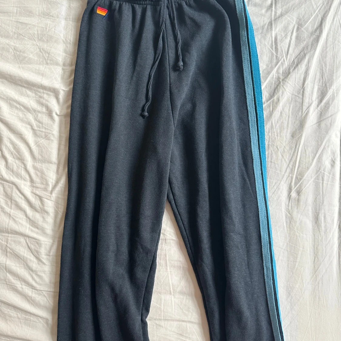 Mörkblå mjukisbyxor från Aviator Nation med blå och turkosa ränder längs ena benet. Byxorna har dragsko i midjan och är tillverkade i en mjuk blandning av polyester, bomull och rayon. Perfekta för chill dagar eller när du vill ha en avslappnad look.
