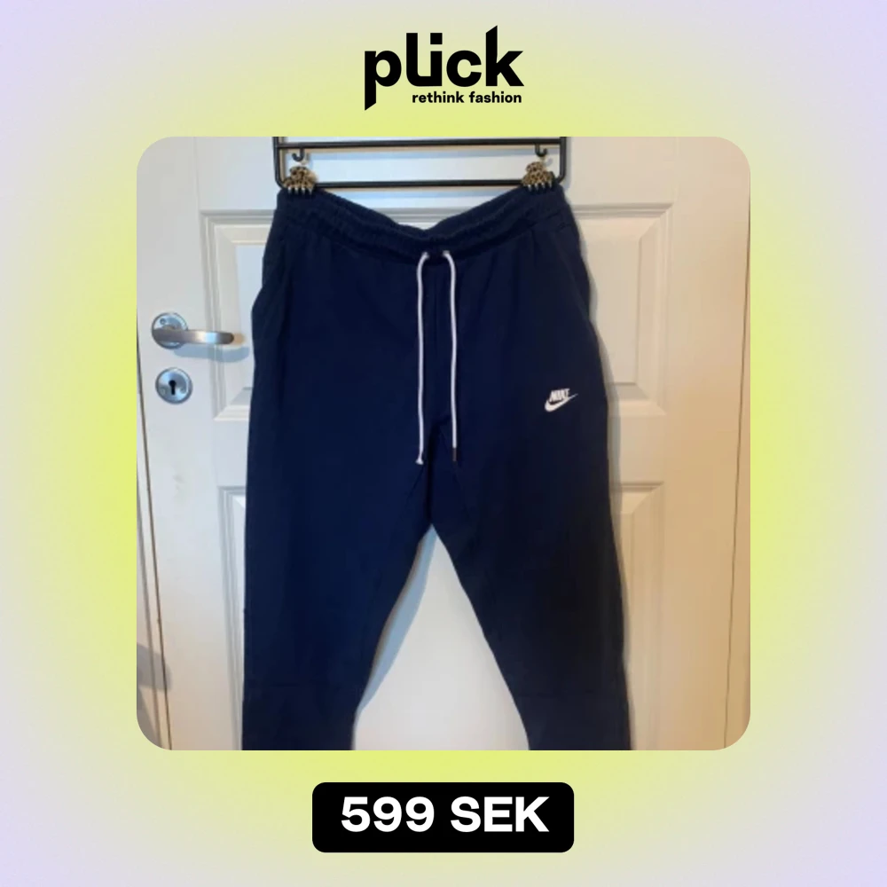 Säljer ett par mörkblå mjukisbyxor från Nike i storlek M. Byxorna har en elastisk midja med vit snörning och en liten vit Nike-logga på vänster ben. De är superbekväma och perfekta för chill eller träning. Byxorna har också en bakficka. Köp dem nu eller ge ett bud! 💙