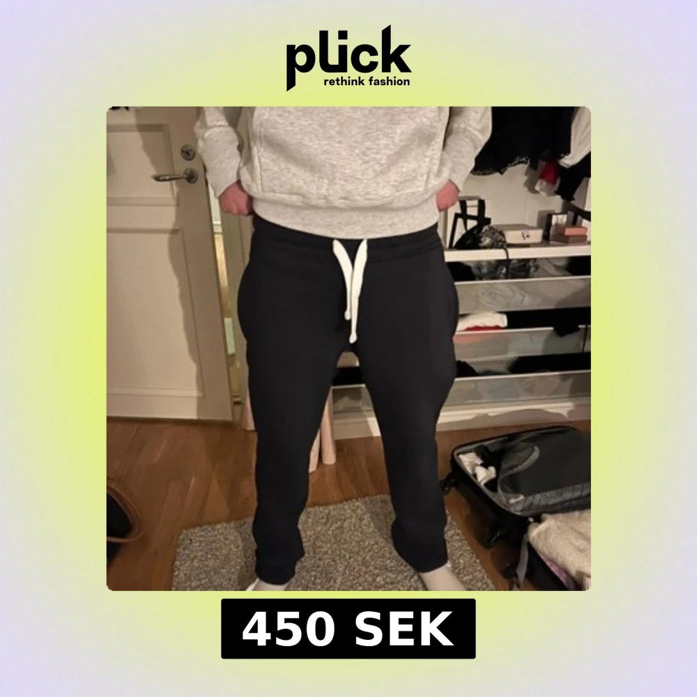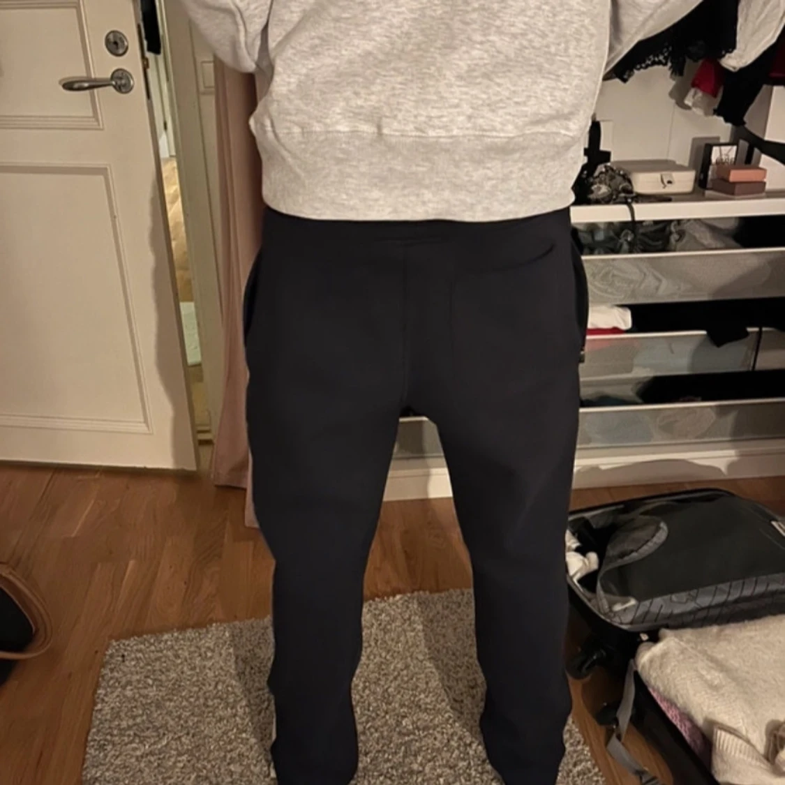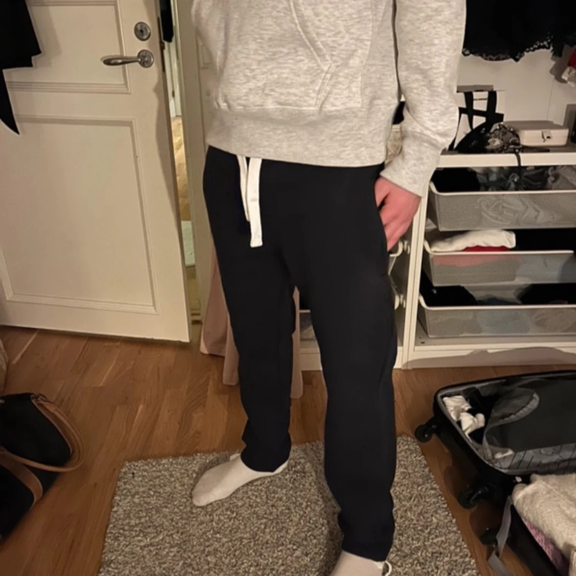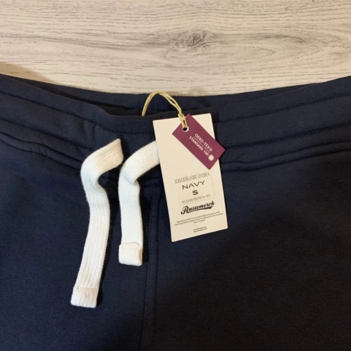 Säljer ett par helt nya mörkblå stilrena mjukisbyxor från det välkända varumärket Russemerch. Byxorna har en bekväm passform med snörning i midjan och är perfekta för en avslappnad stil. De är tillverkade i mjukt material och har elastiska muddar vid bensluten.