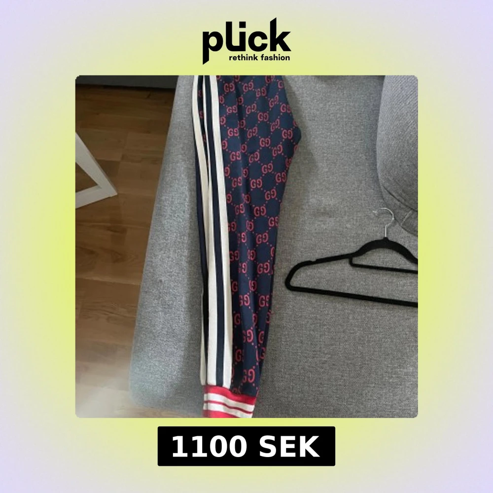 Snygga mörkblå byxor från Gucci med det ikoniska röda GG-mönstret. Byxorna har vita och svarta ränder längs sidorna och ribbade muddar i rött och vitt vid bensluten. Perfekta för en stilren och sportig look.